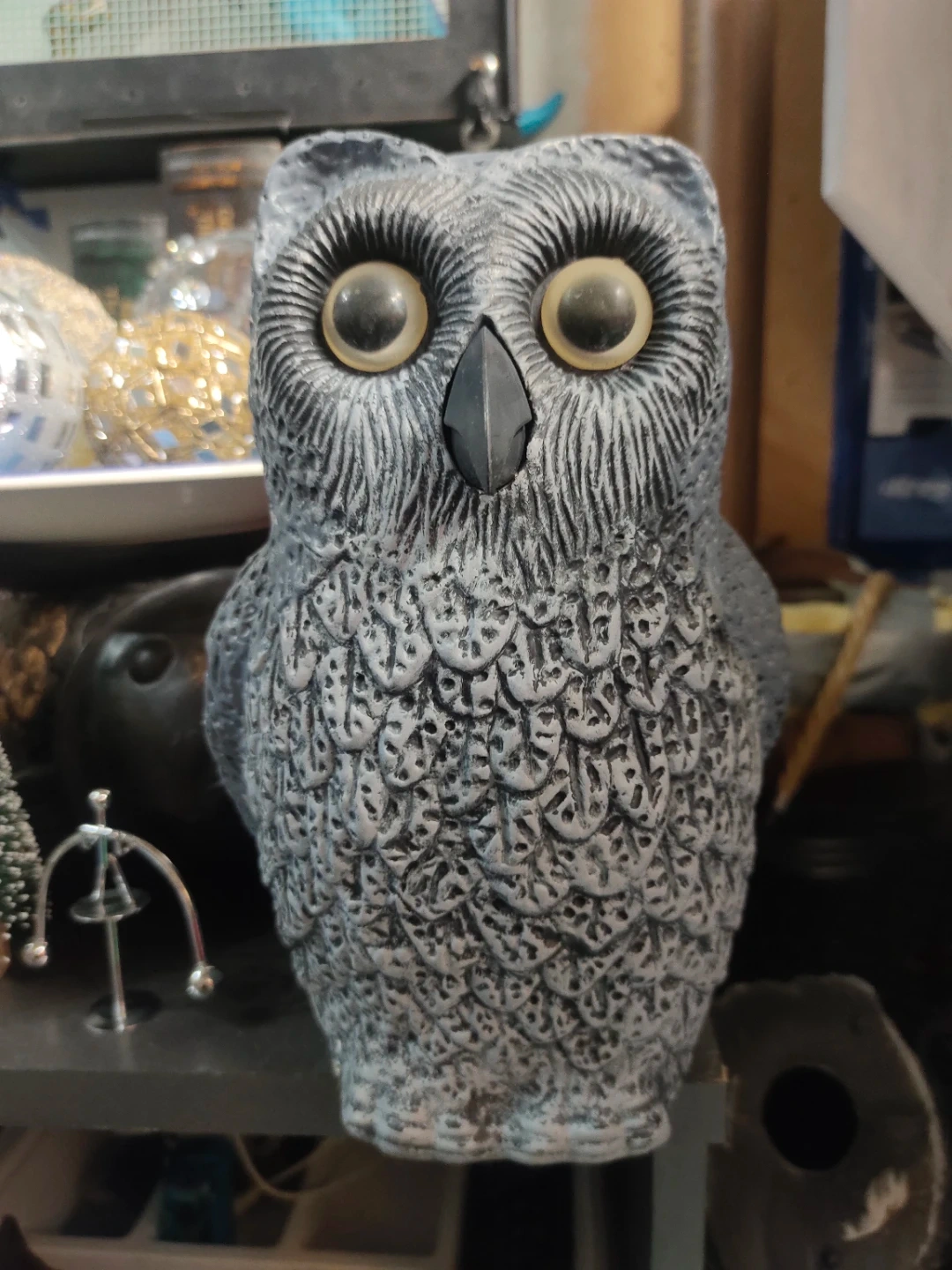 This is a decorative owl figurine with a grey textured finish. It has large, round, yellow-tinted eyes and a black beak. The detailing on the feathers is quite intricate. It's a charming piece for display.