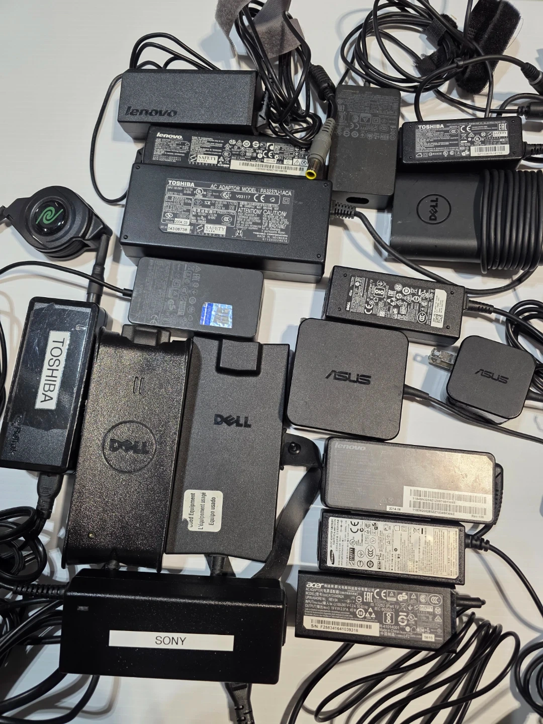This is a bundle of various laptop power adapters. Brands included are Dell, Lenovo, Toshiba, Sony, and Asus. Various models and wattages are present. $15 each.