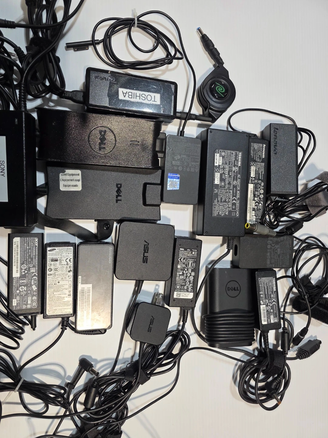 This is a bundle of various laptop power adapters. Brands included are Dell, Lenovo, Toshiba, Sony, and Asus. Various models and wattages are present. $15 each.