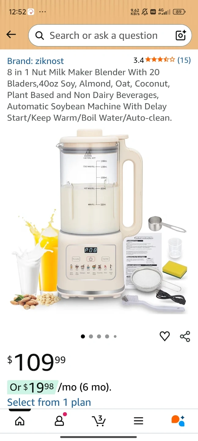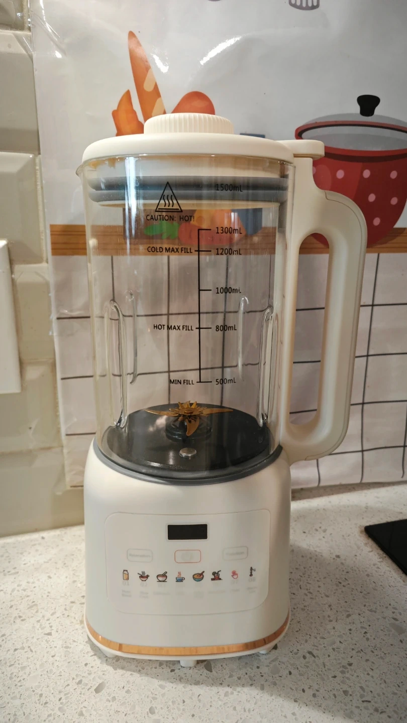 This Ziknost 8-in-1 blender makes nut milk, soy milk, and more. It features automatic soybean machine functions with delay start and keep warm options. The glass pitcher has clear measurement markings up to 1300mL for cold liquids and 1000mL for hot liquids.
