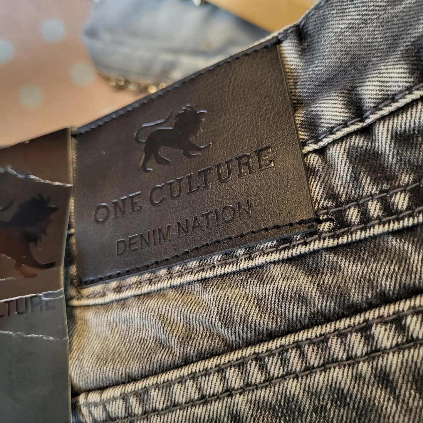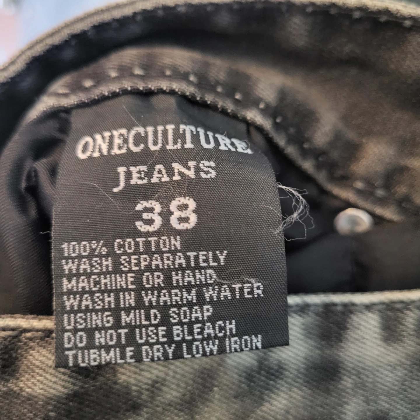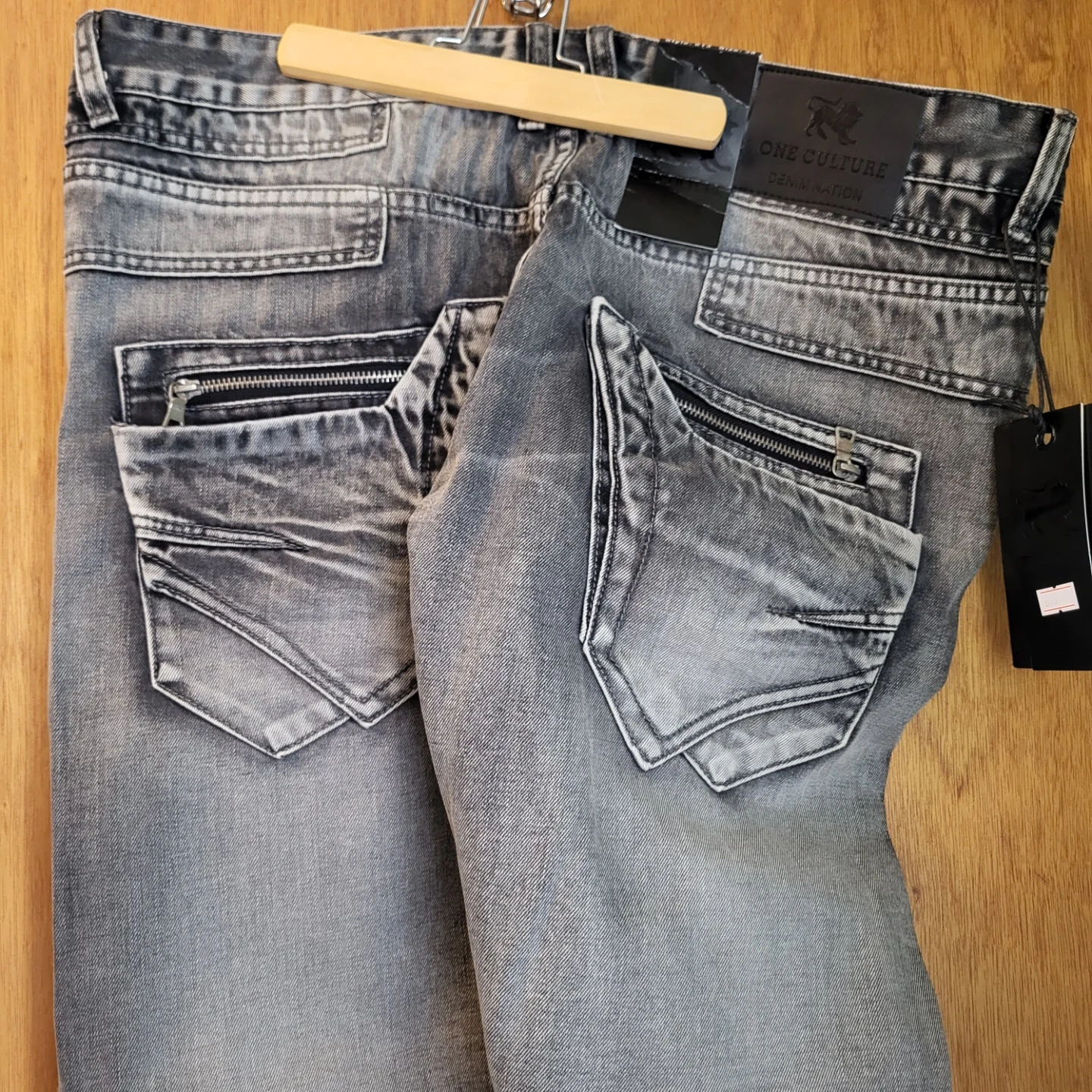 220Selling a pair of One Culture Denim Nation jeans in size 38. They're made of 100% cotton and have a unique design with zipper details on the back pockets. These jeans are in great condition and ready for a new home! 44 inch length