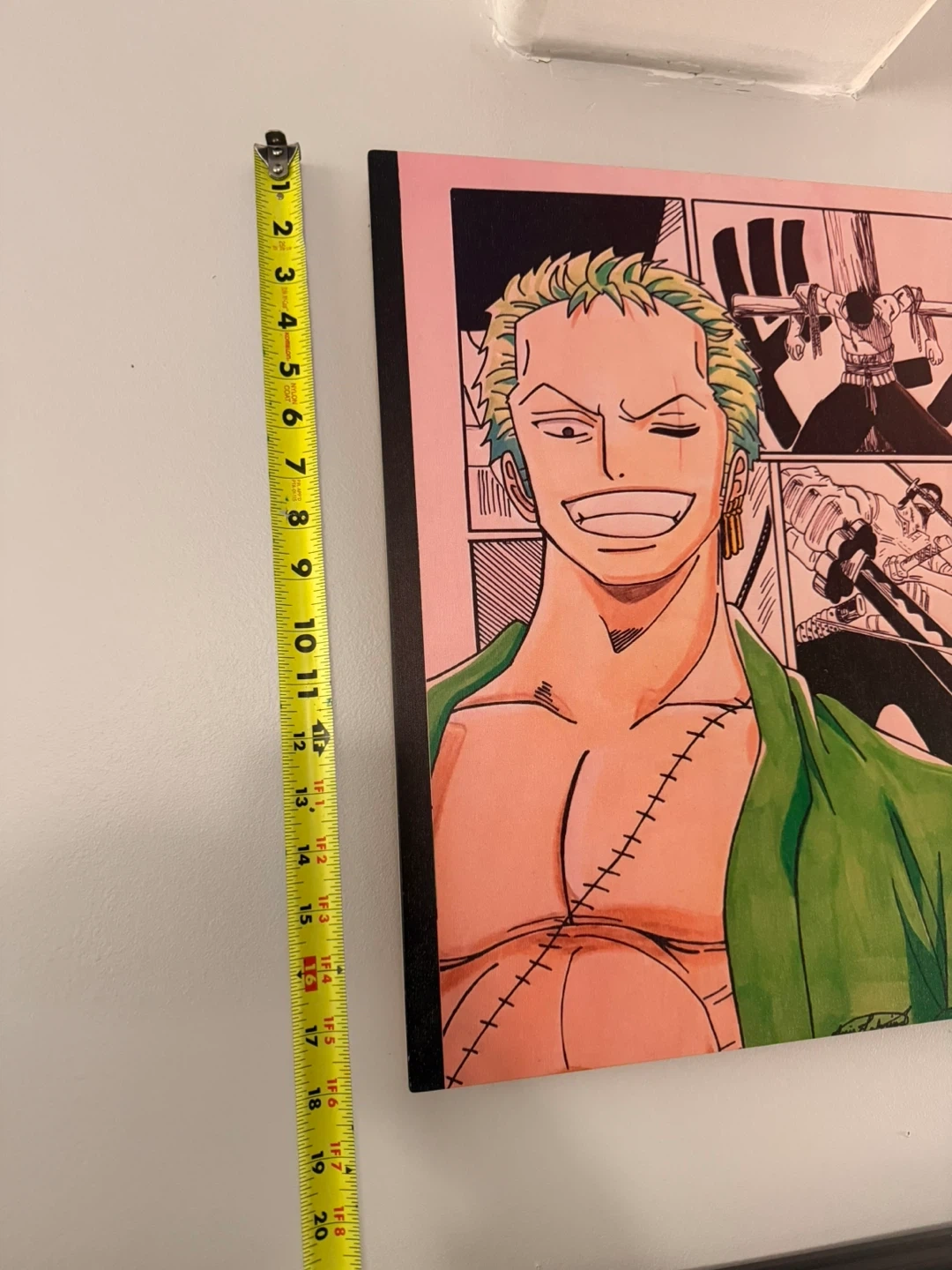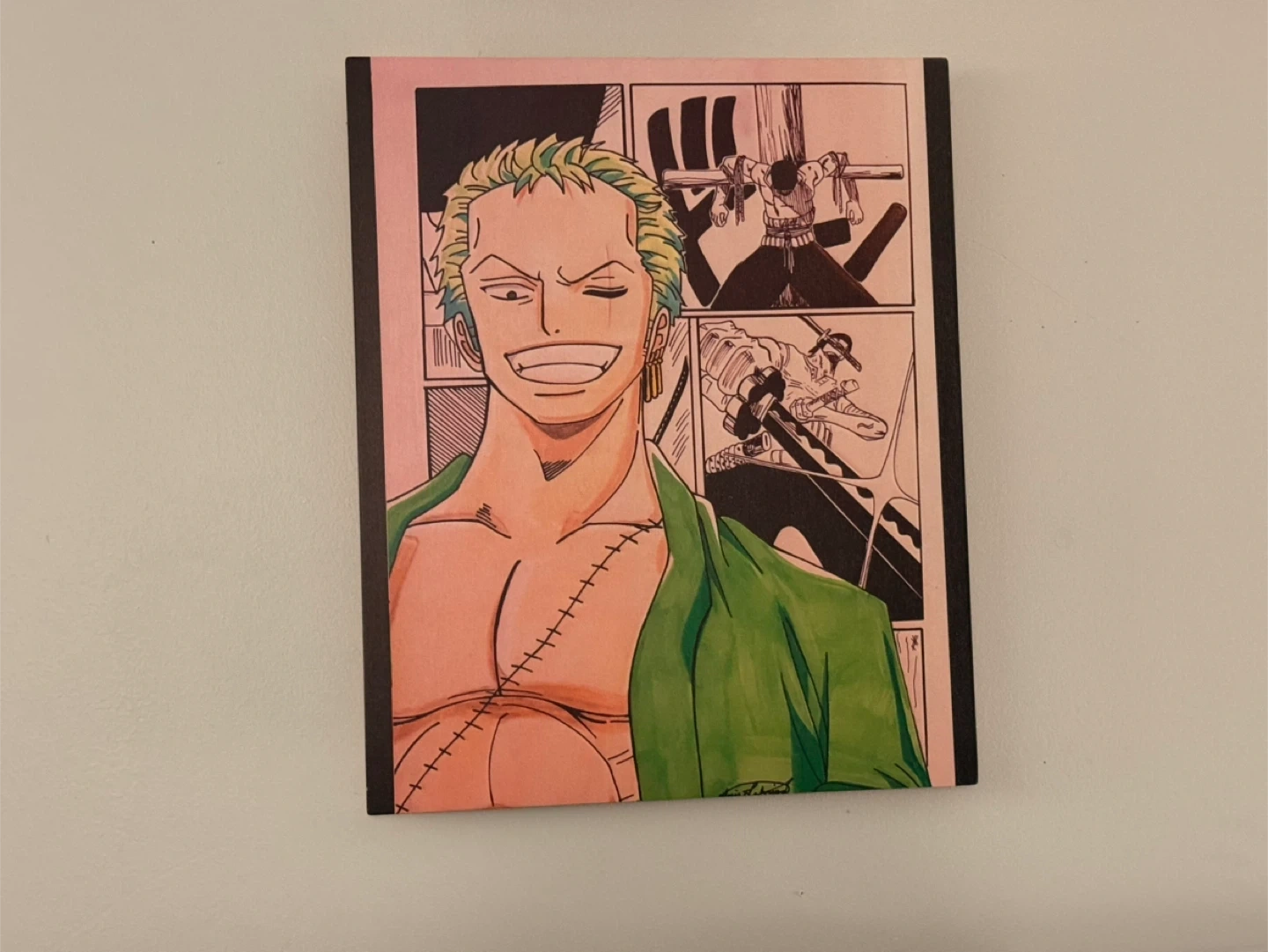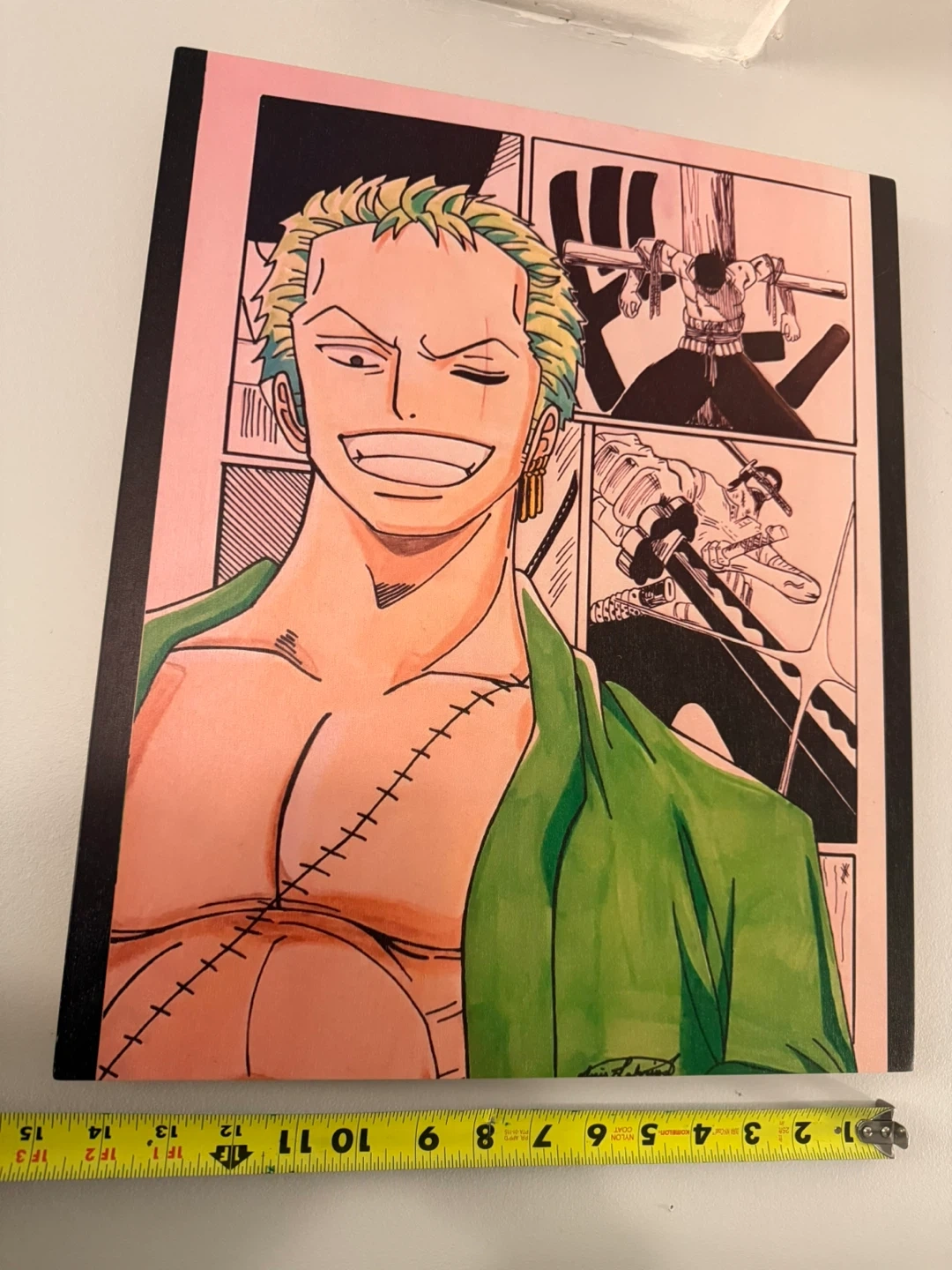 COMPLETELY MADE OF WOODSelling a One Piece Zoro anime art piece. It measures approximately 15 inches in width and 20 inches in height. A great addition for any anime fan!