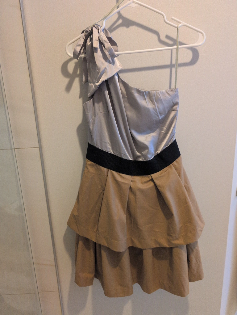 Selling a cute one-shoulder dress! It features a silver top with a stylish bow detail and a tan, tiered skirt. The dress also has a black band at the waist. Perfect for a special occasion or a night out!