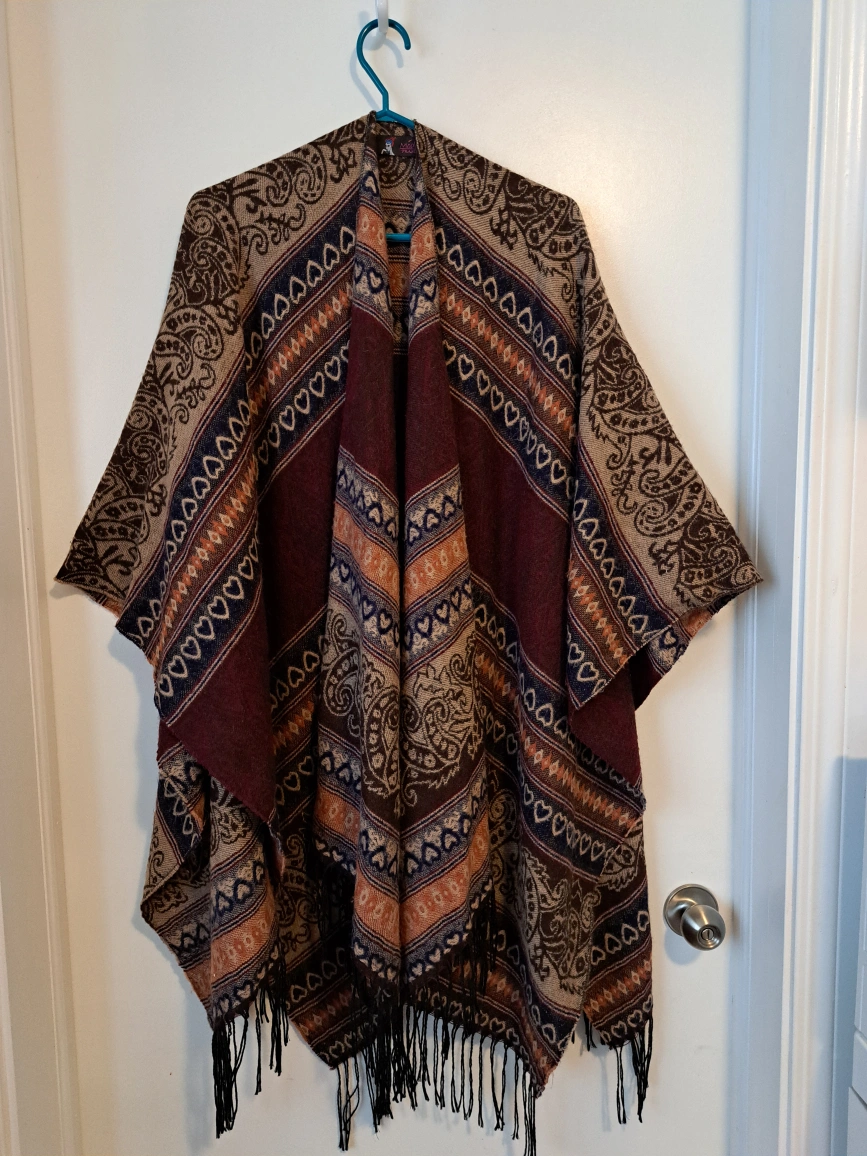 112Made from a single piece of fabric with a v-shaped cut, so fits any size of person. Good for using when chilly at your desk, as it covers your arms without obstructing your hands. 100% acrylic, recommend a delicates bag for machine wash to protect the fringe.