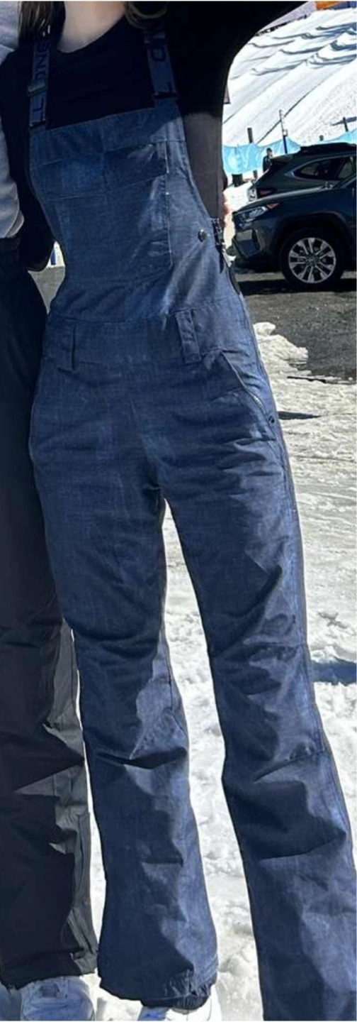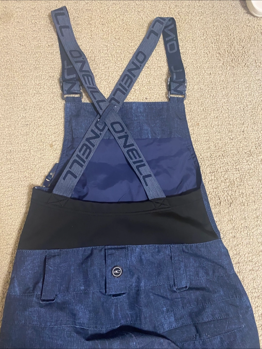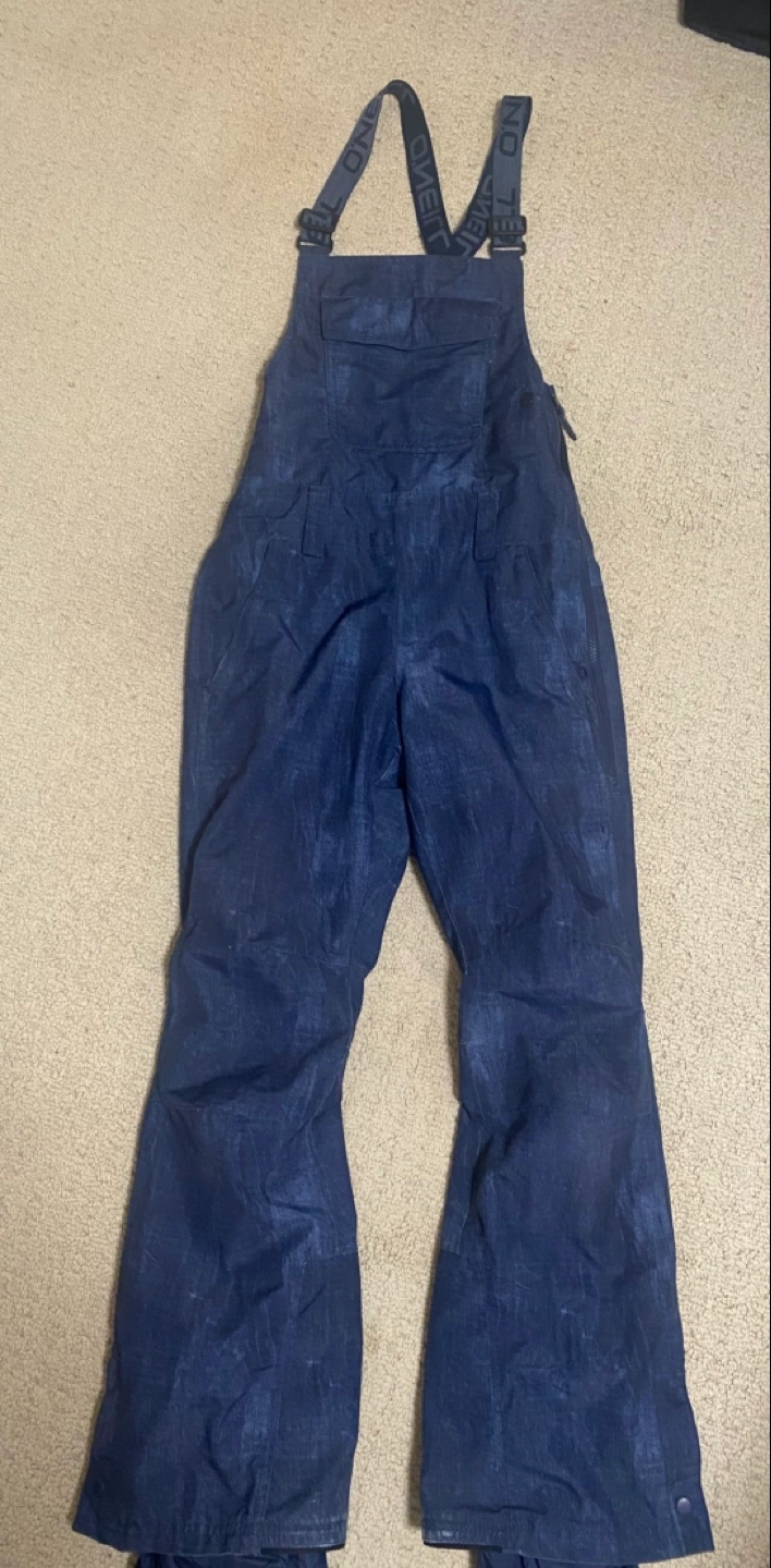 170Women's O'Neill snow pants. Size XS. Slim fit. Dark blue denim-like pattern. Adjustable suspenders.