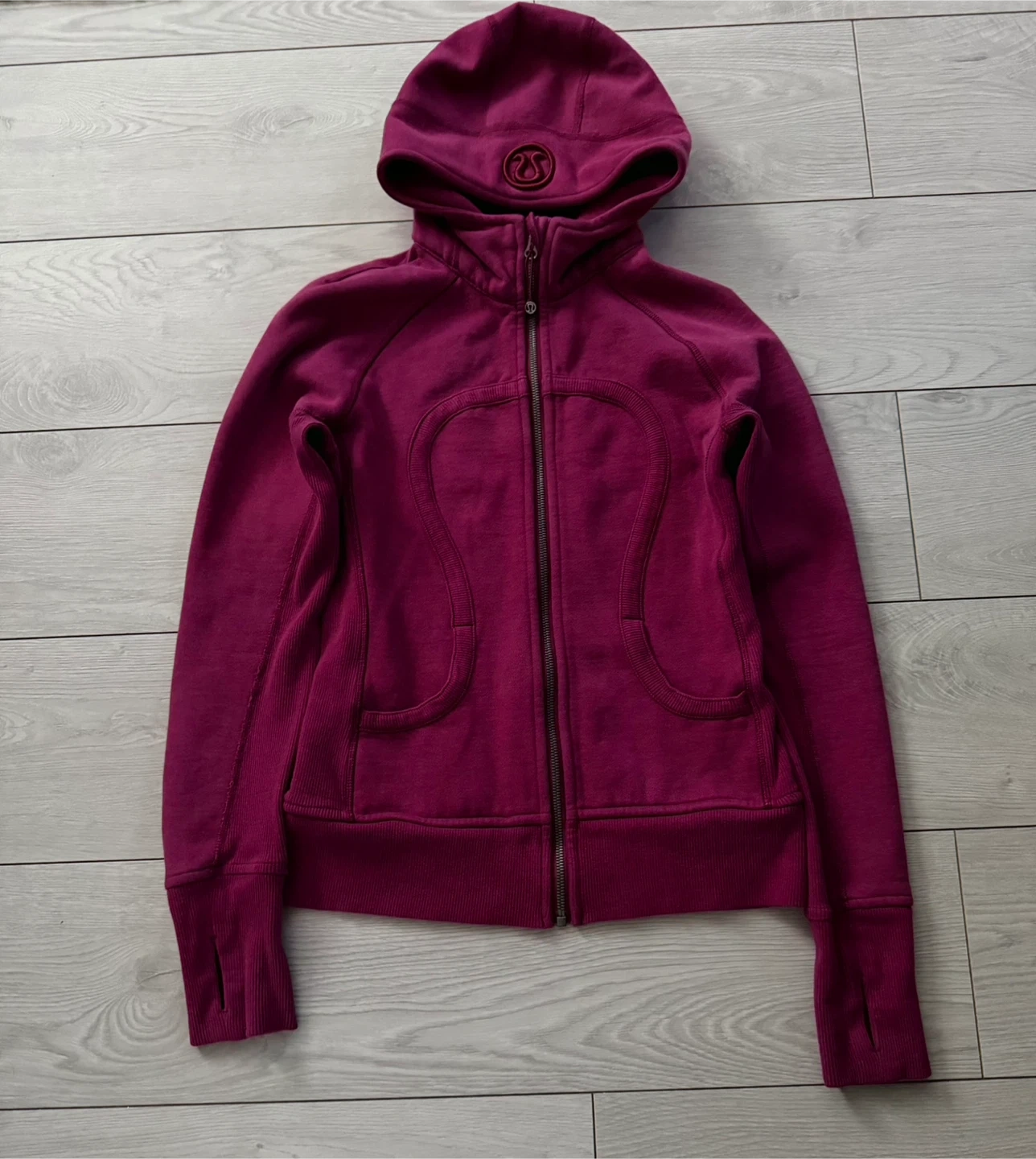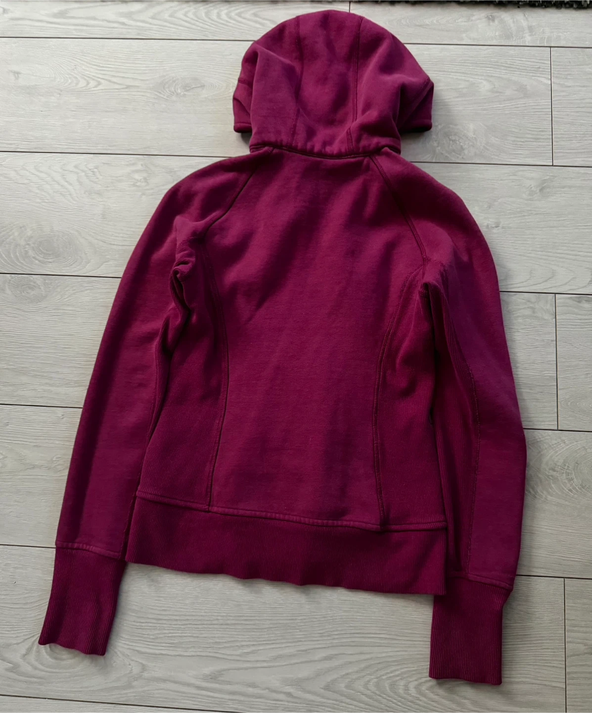 This is a Lululemon Athletica full zip hoodie in a berry colour. It's made of a soft, comfortable fabric with thumbholes in the sleeves. It has a classic fit and a full zip closure.