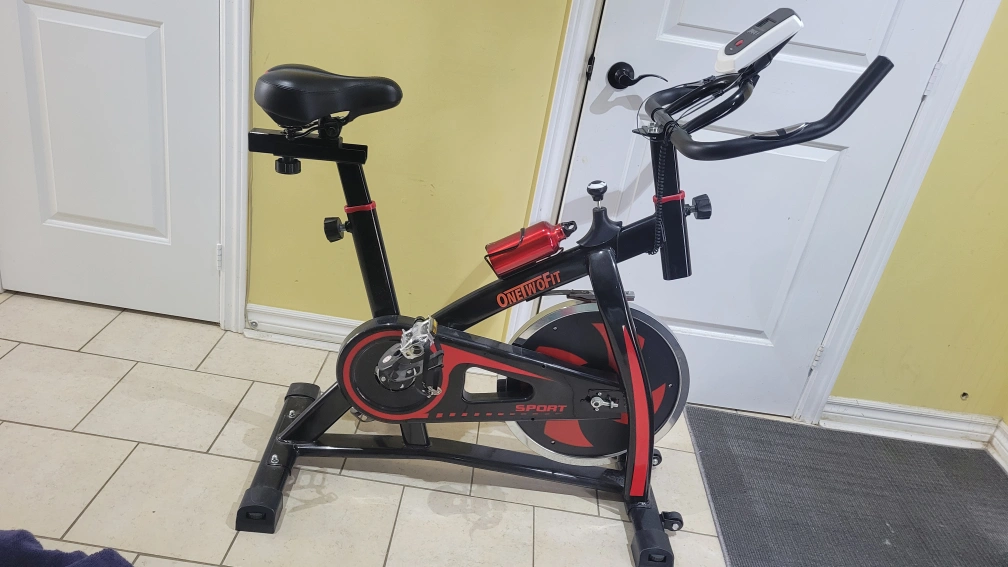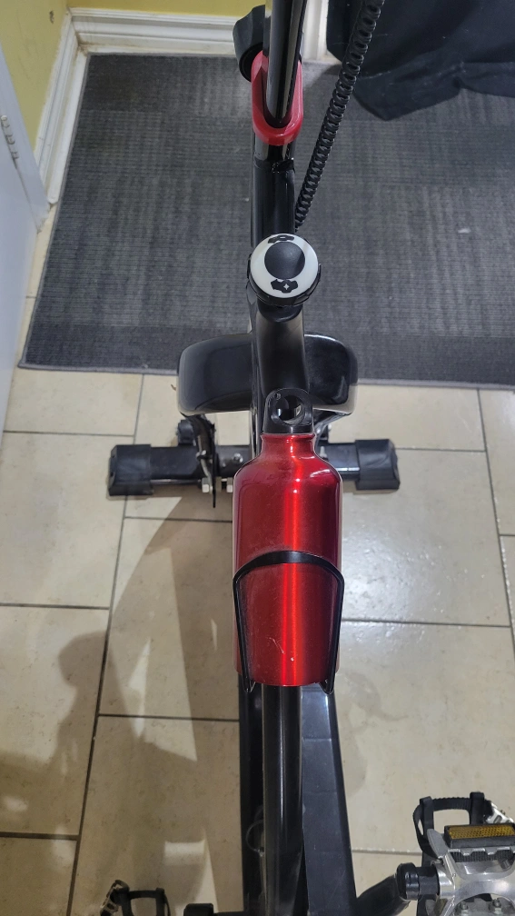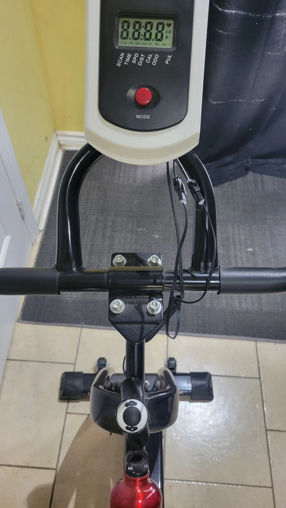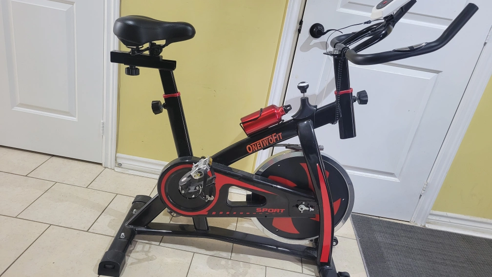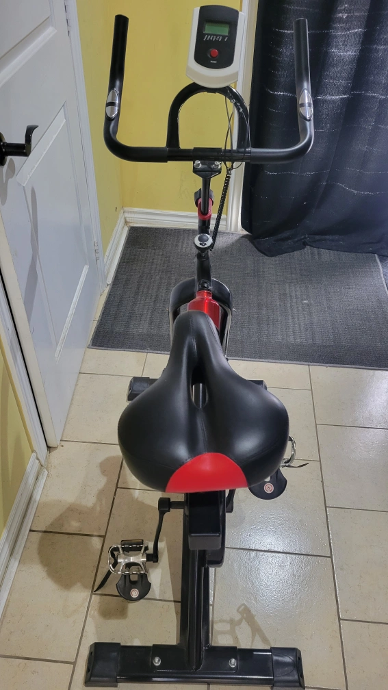 10Indoor cycling bike. Black and red frame. Adjustable seat and handlebars. Digital monitor tracks workout data. Includes water bottle cage. Good for home workouts.