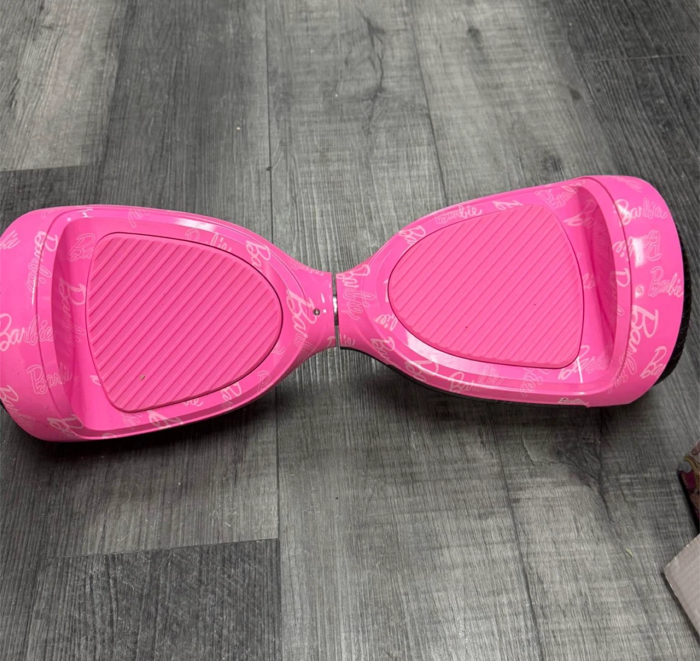 Bright pink Barbie hoverboard with light-up wheels. It supports up to 150 lbs max weight and has 6" tires. Max speed is 6 MPH with a 3 mile range. Fun for rides around the neighbourhood!