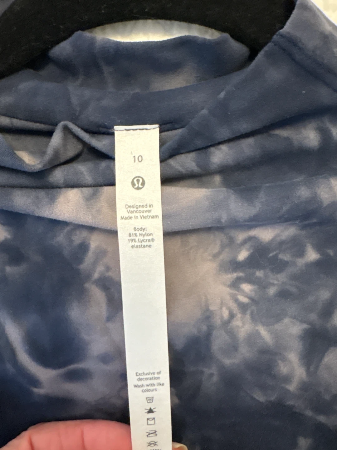 This Lululemon mock neck long sleeve top features a tie-dye pattern. It's made from 81% nylon and 19% Lycra® elastane. Designed in Vancouver and made in Vietnam. Size 10