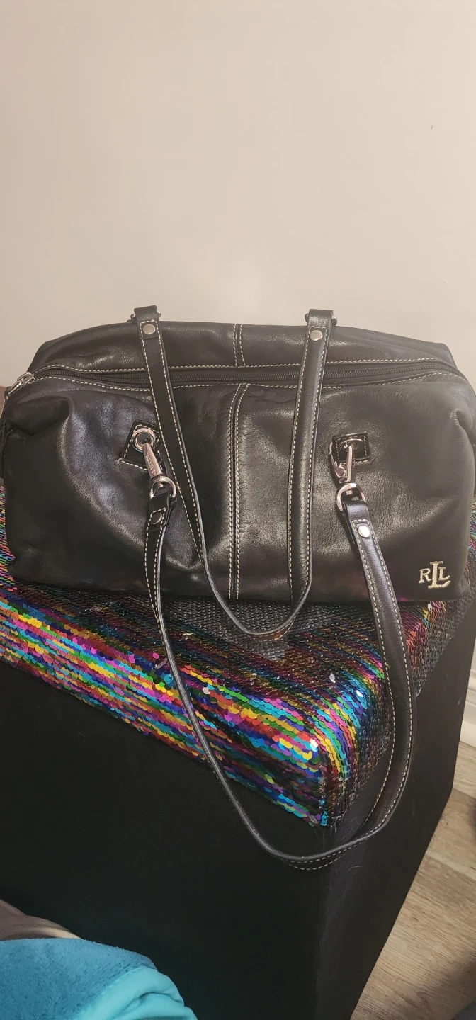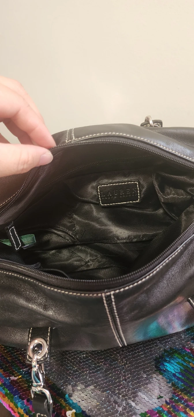 A black leather shoulder bag by Lauren Ralph Lauren. It features silver-toned hardware and contrast stitching. Interior includes a zippered compartment.