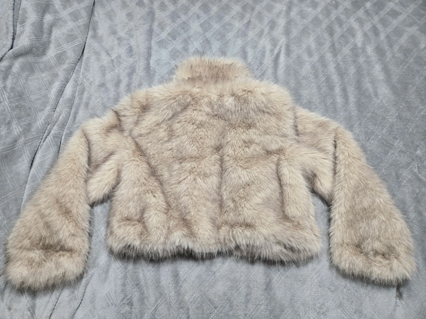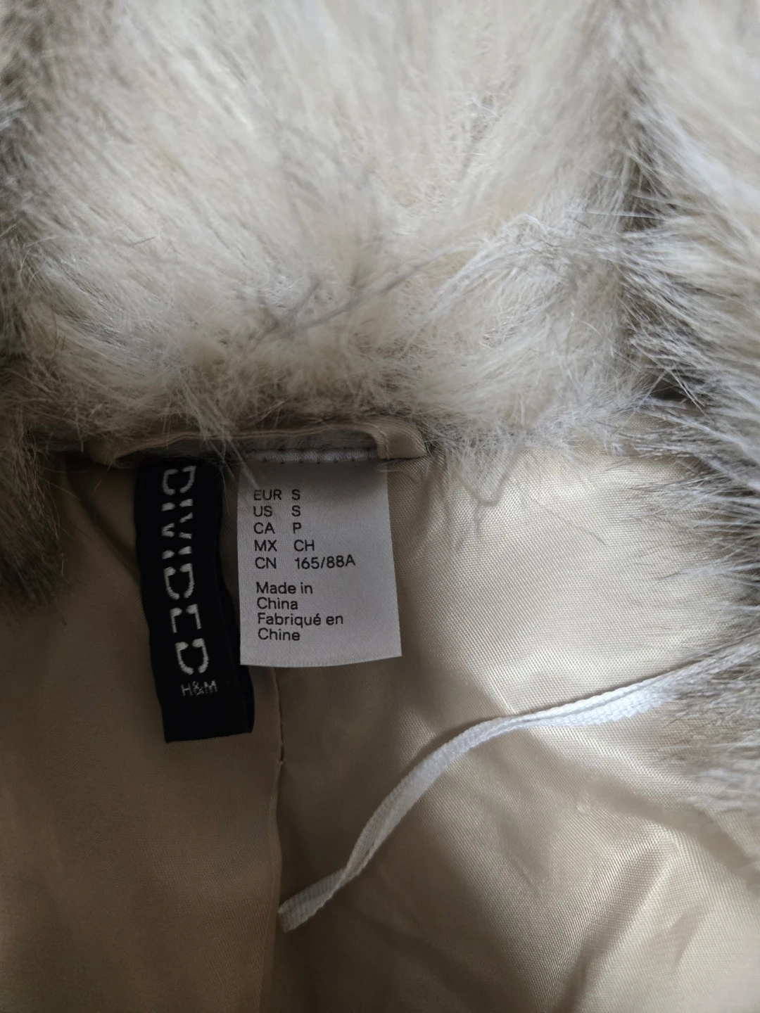 This is a faux fur jacket from DIVIDED by H&M. It's a cropped style with a satin lining. The colour is a light, neutral tone.