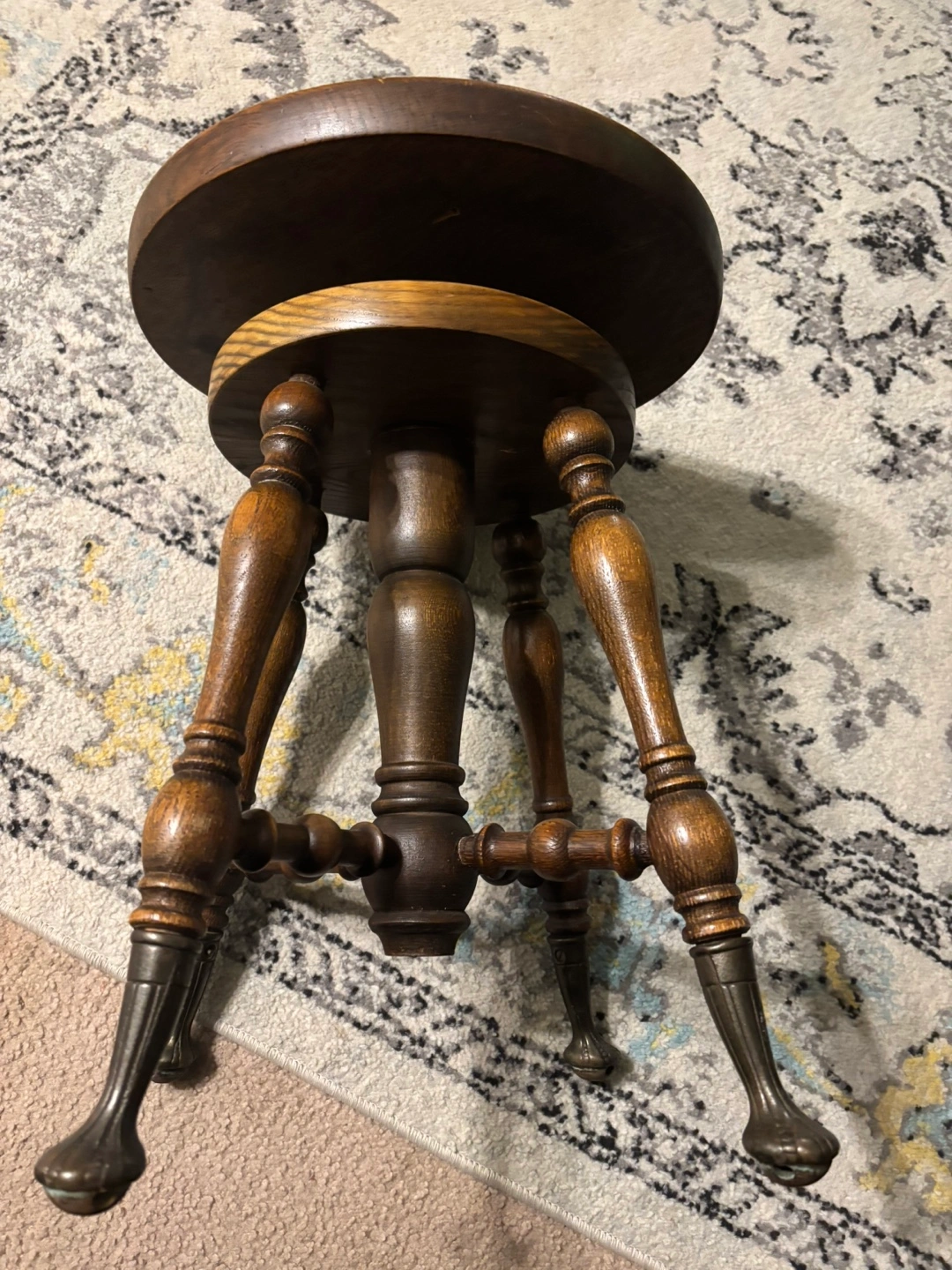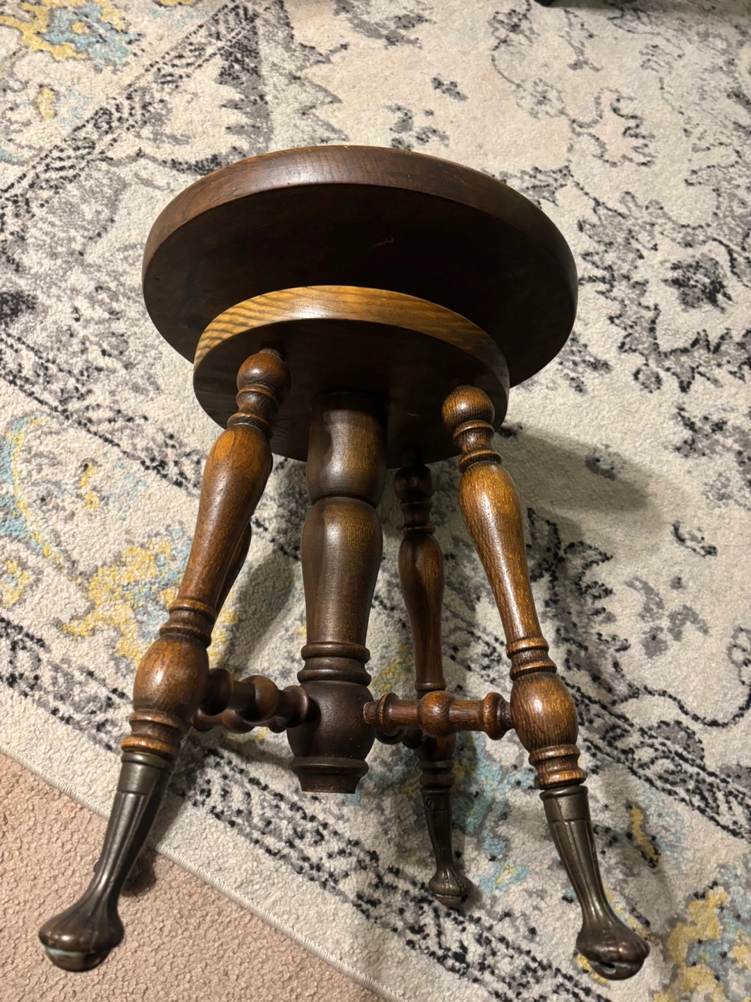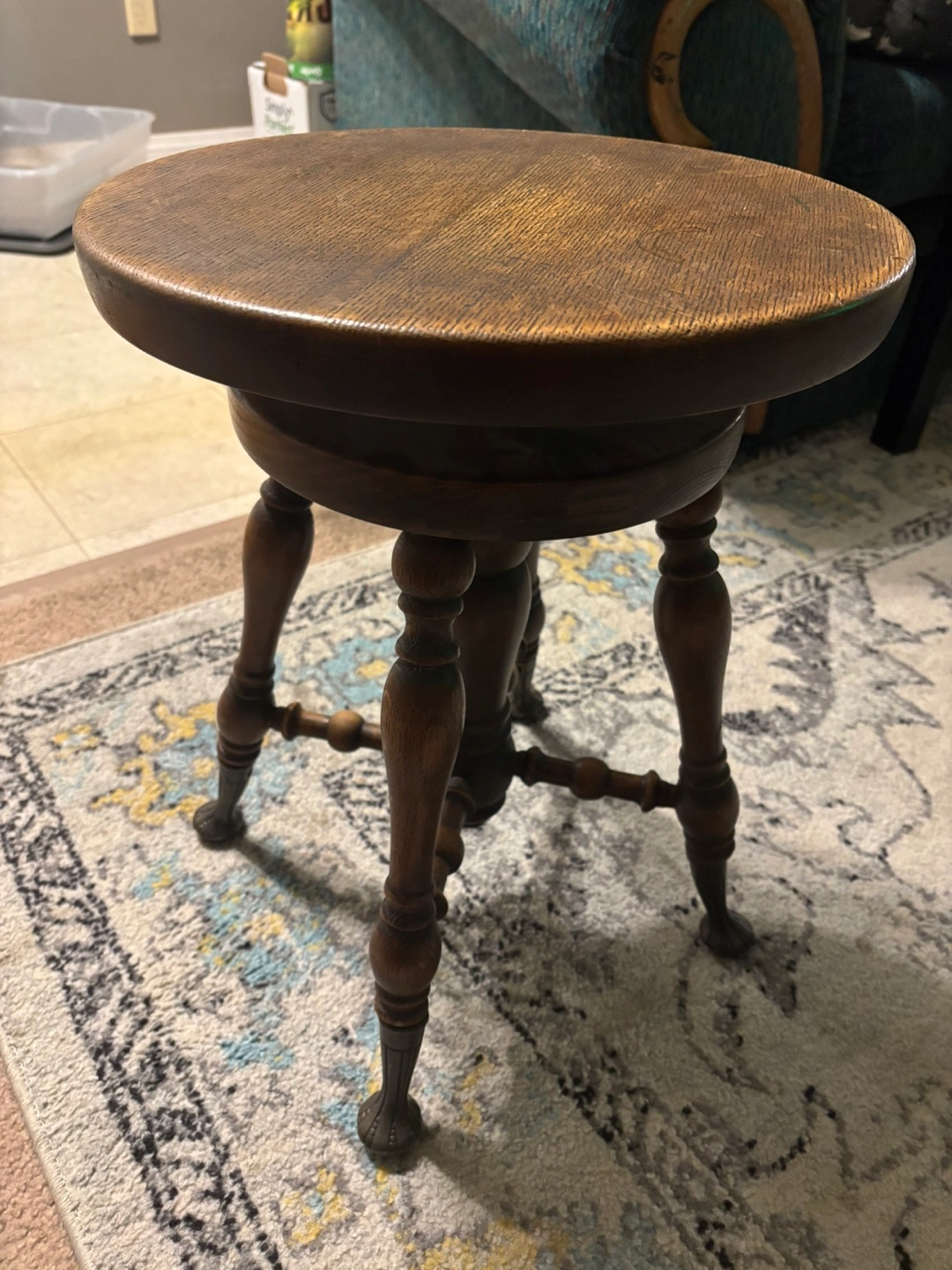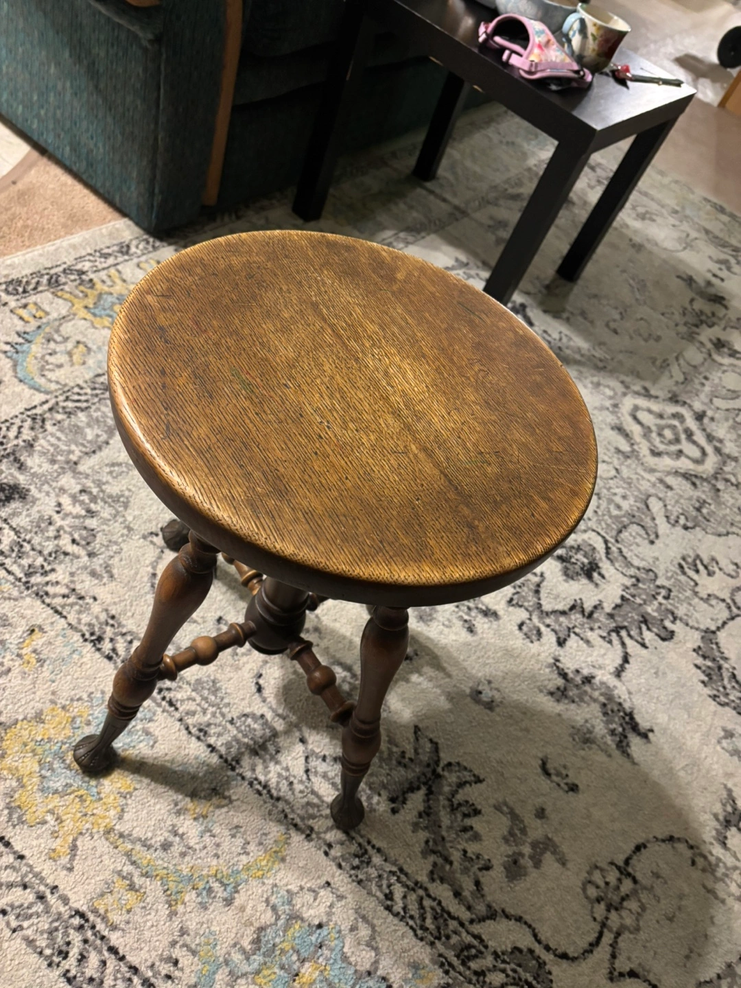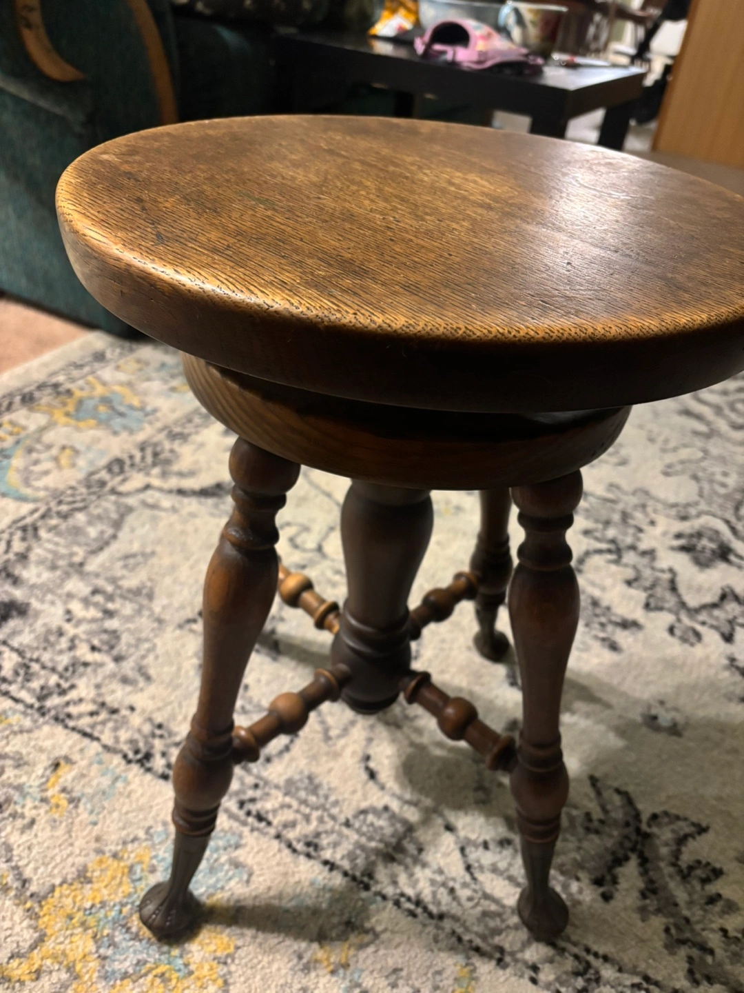 Selling a lovely vintage wooden piano stool! It features a classic design with a round seat and ornate legs. It's a great piece to add some character to your home