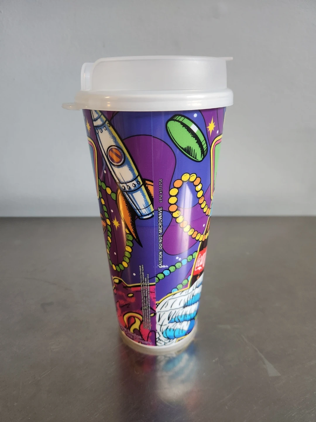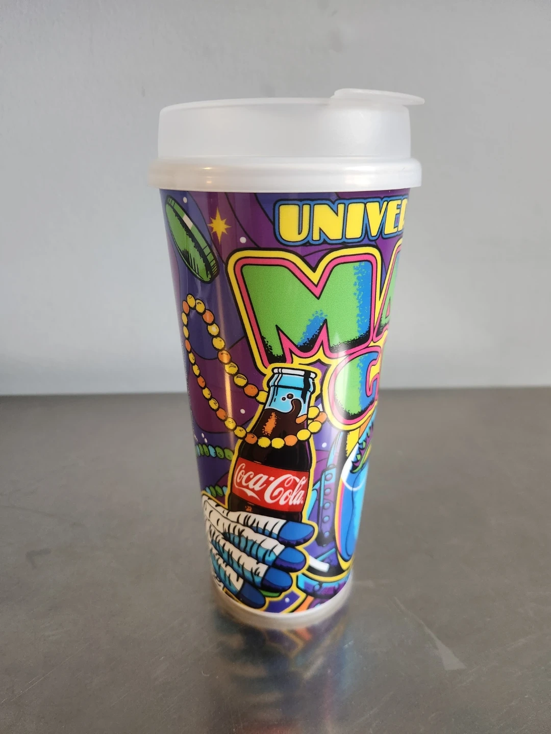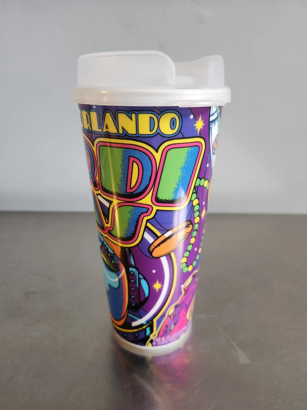 Reusable tumbler featuring a vibrant Mardi Gras design from Universal Studios Orlando. Includes a white plastic lid with a flip-top closure. Copyrighted 2022.