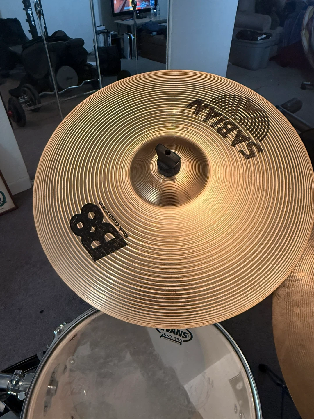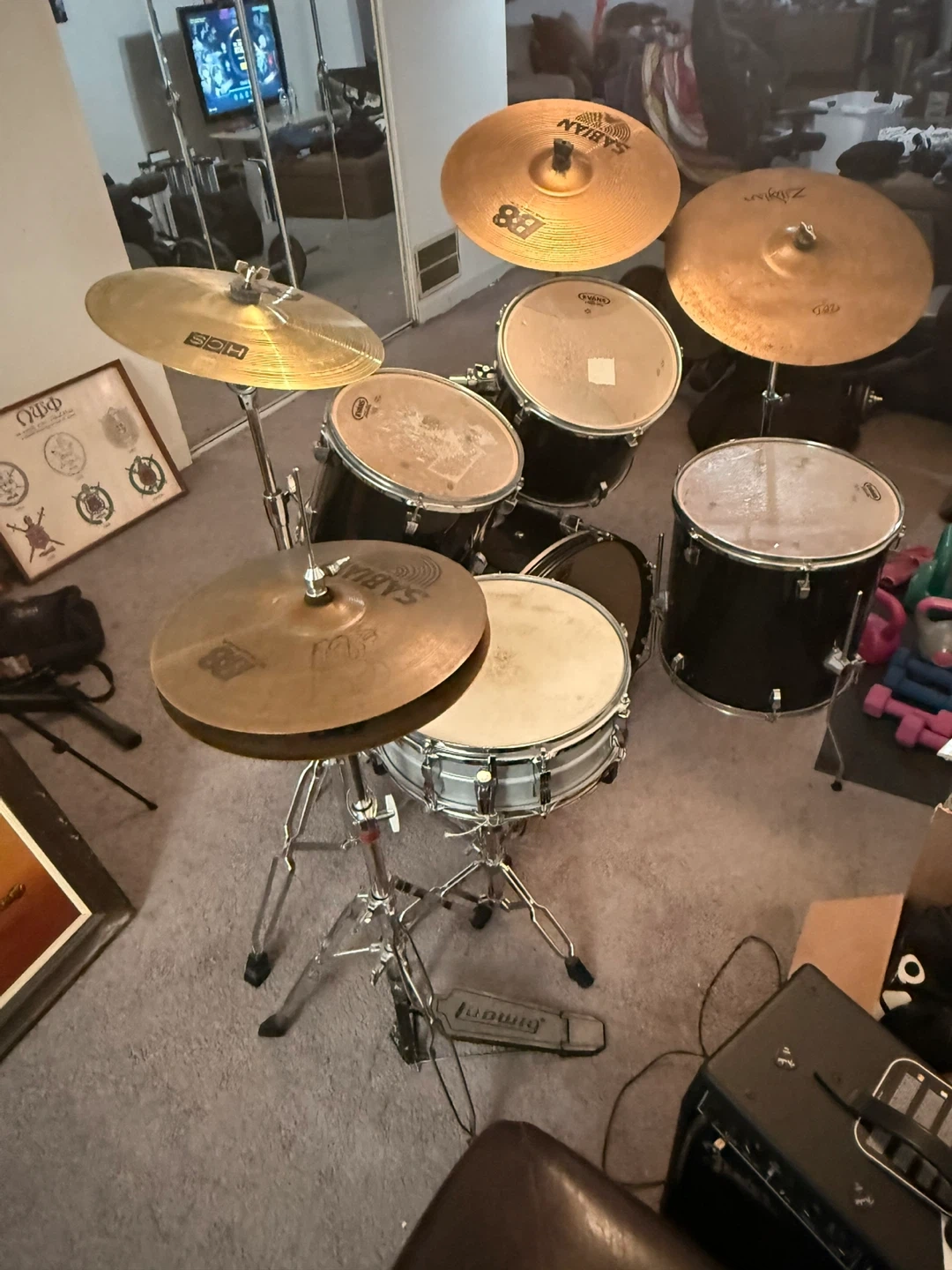 This is a Ludwig drum set featuring Sabian cymbals. It includes multiple drums, stands, and two bass pedals. Also comes with a bag of tambourines for added fun. Everything you need to get started playing!