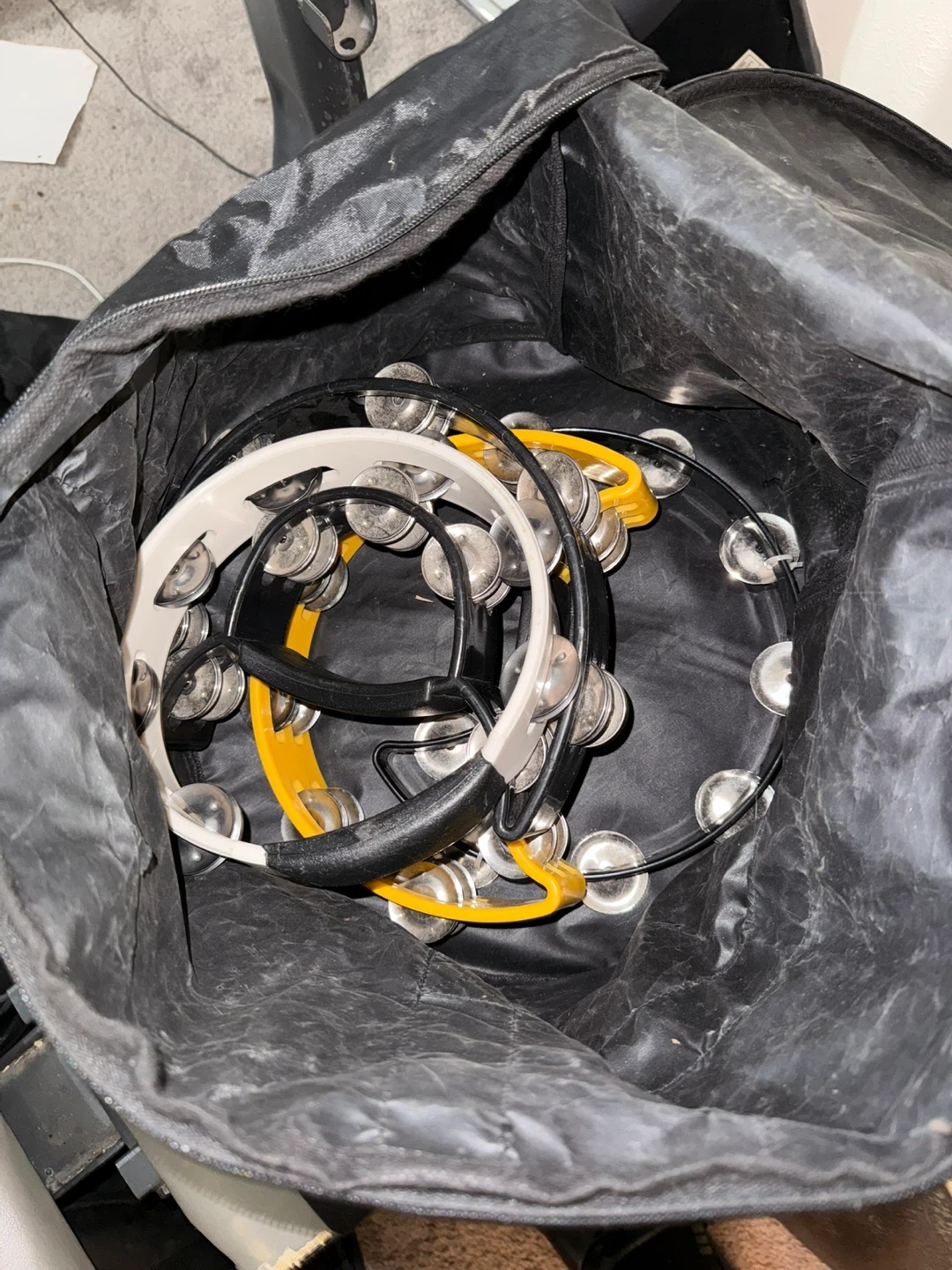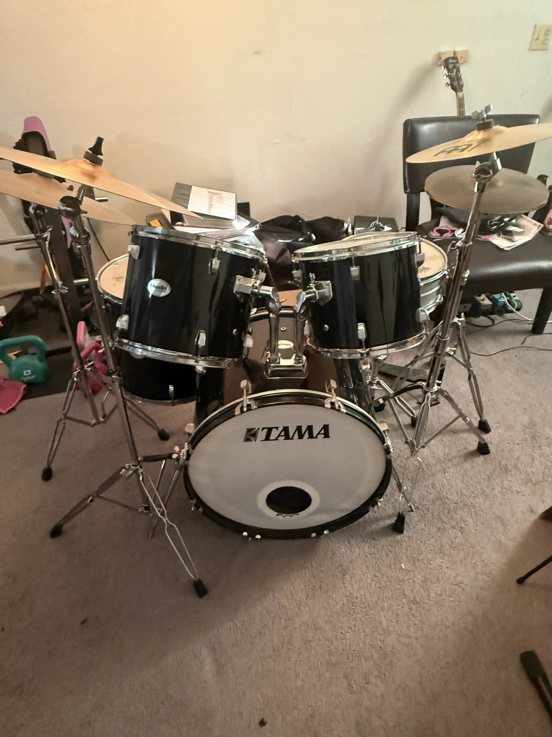 This is a Ludwig drum set featuring Sabian cymbals. It includes multiple drums, stands, and two bass pedals. Also comes with a bag of tambourines for added fun. Everything you need to get started playing!