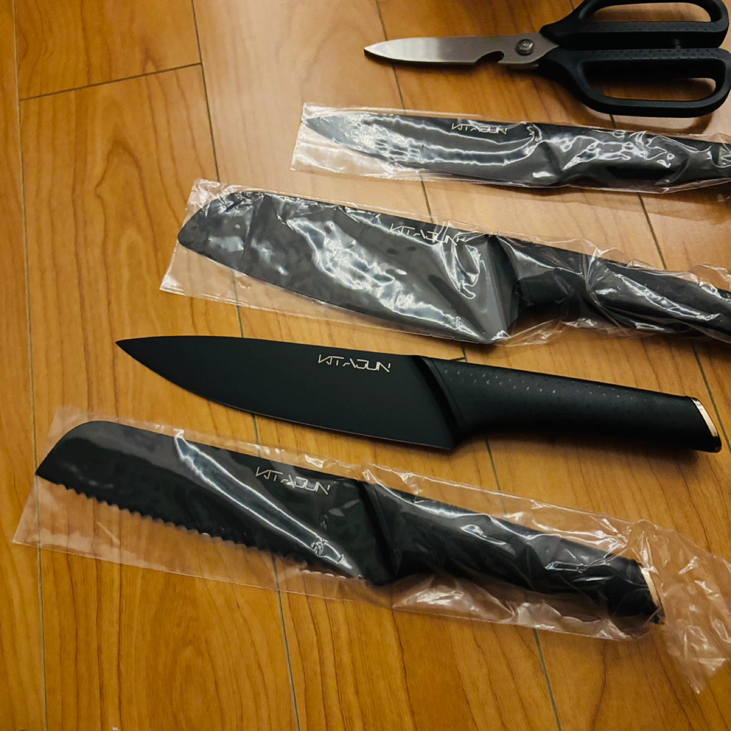 Selling a KITAJUN knife set, complete with a sterilizing knife block. It includes several knives and scissors, with sharpening stone. Japanese design - black with copper accents - from Germany. Block plugs in and disinfects knives!