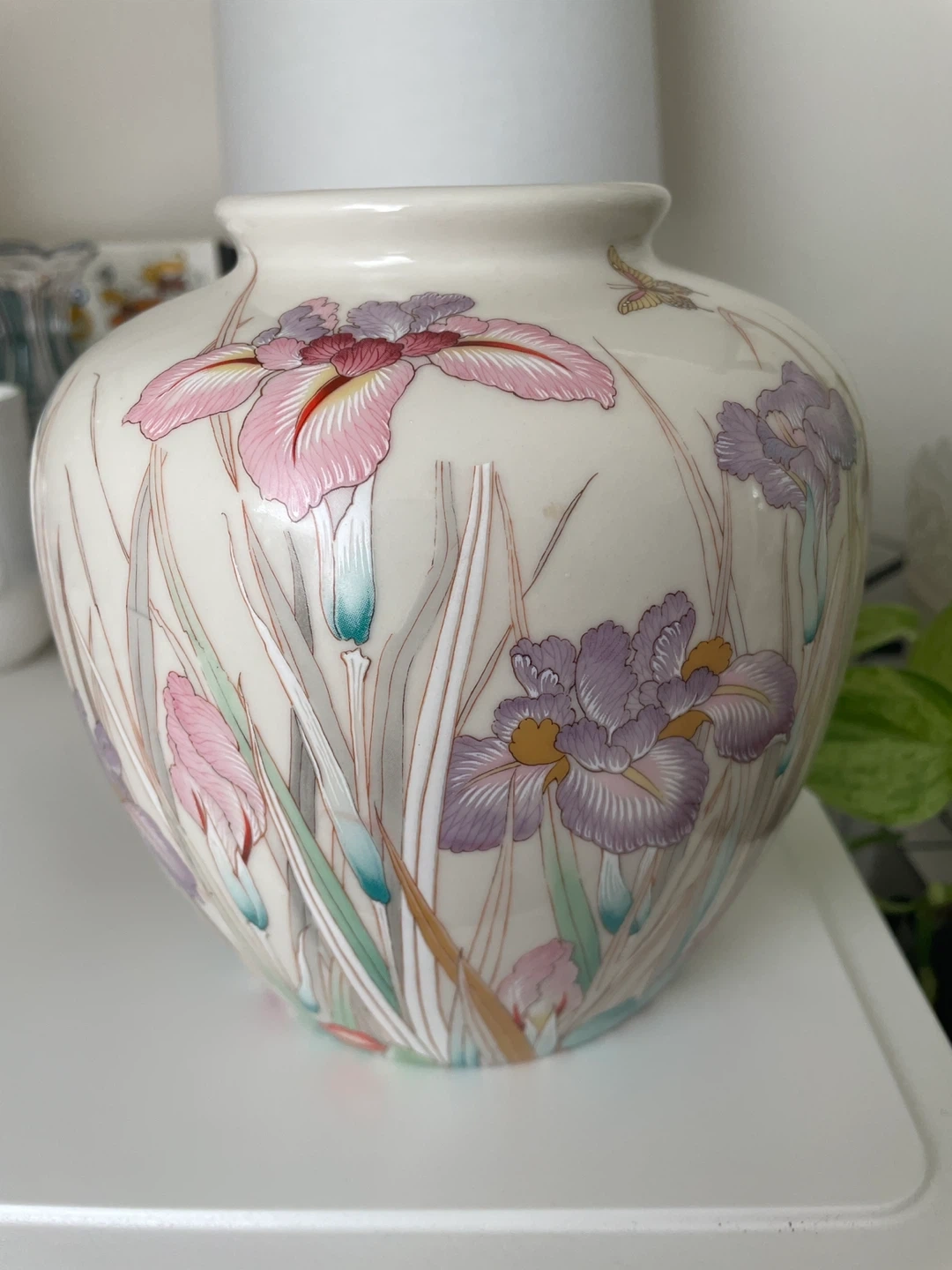 A lovely vintage vase featuring a hand painted iris and butterfly design. Ceramic glazed, perfect condition. Made in Japan.