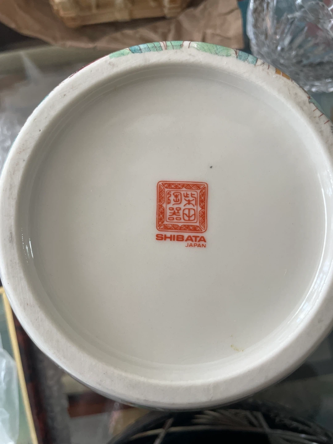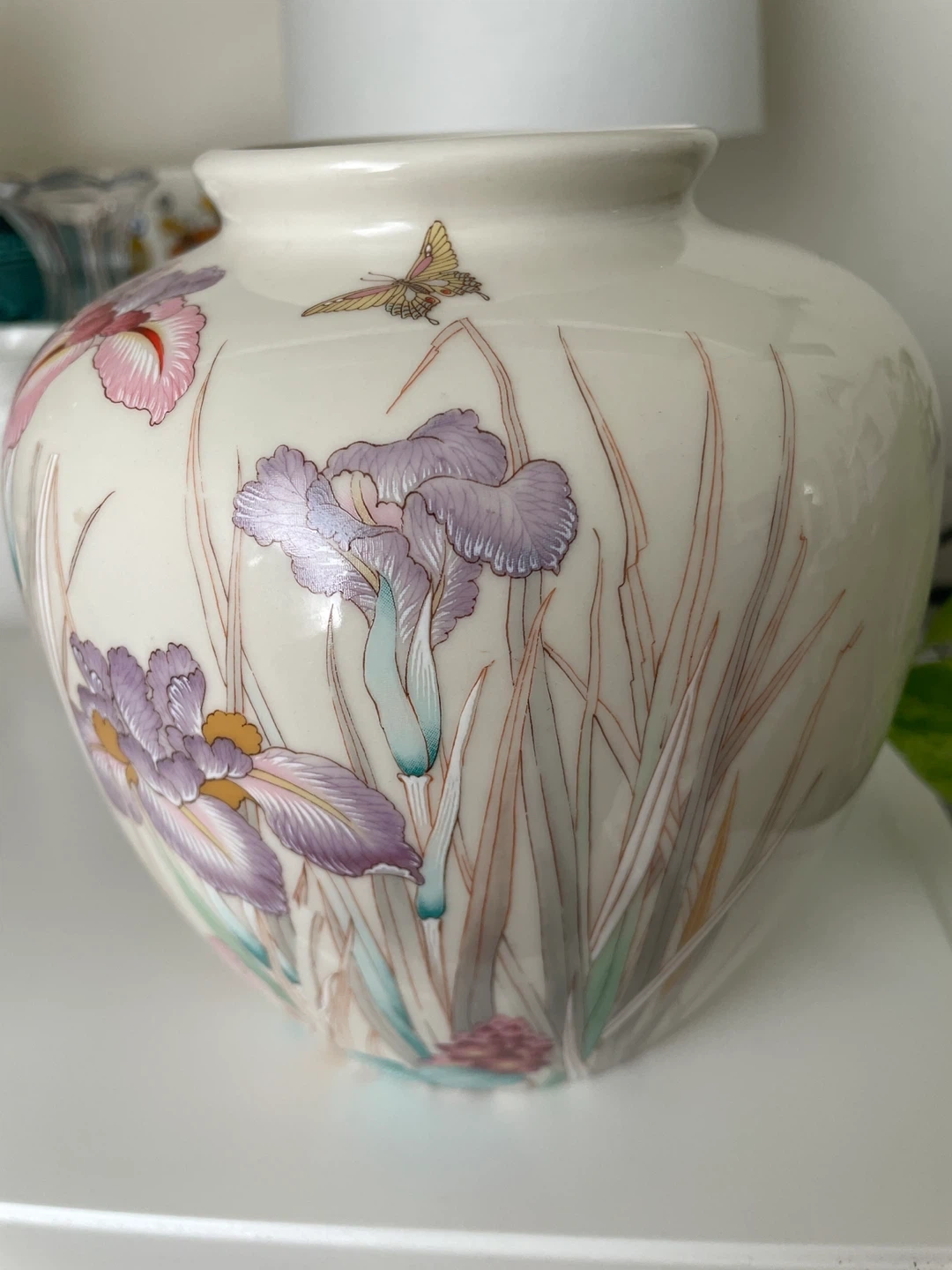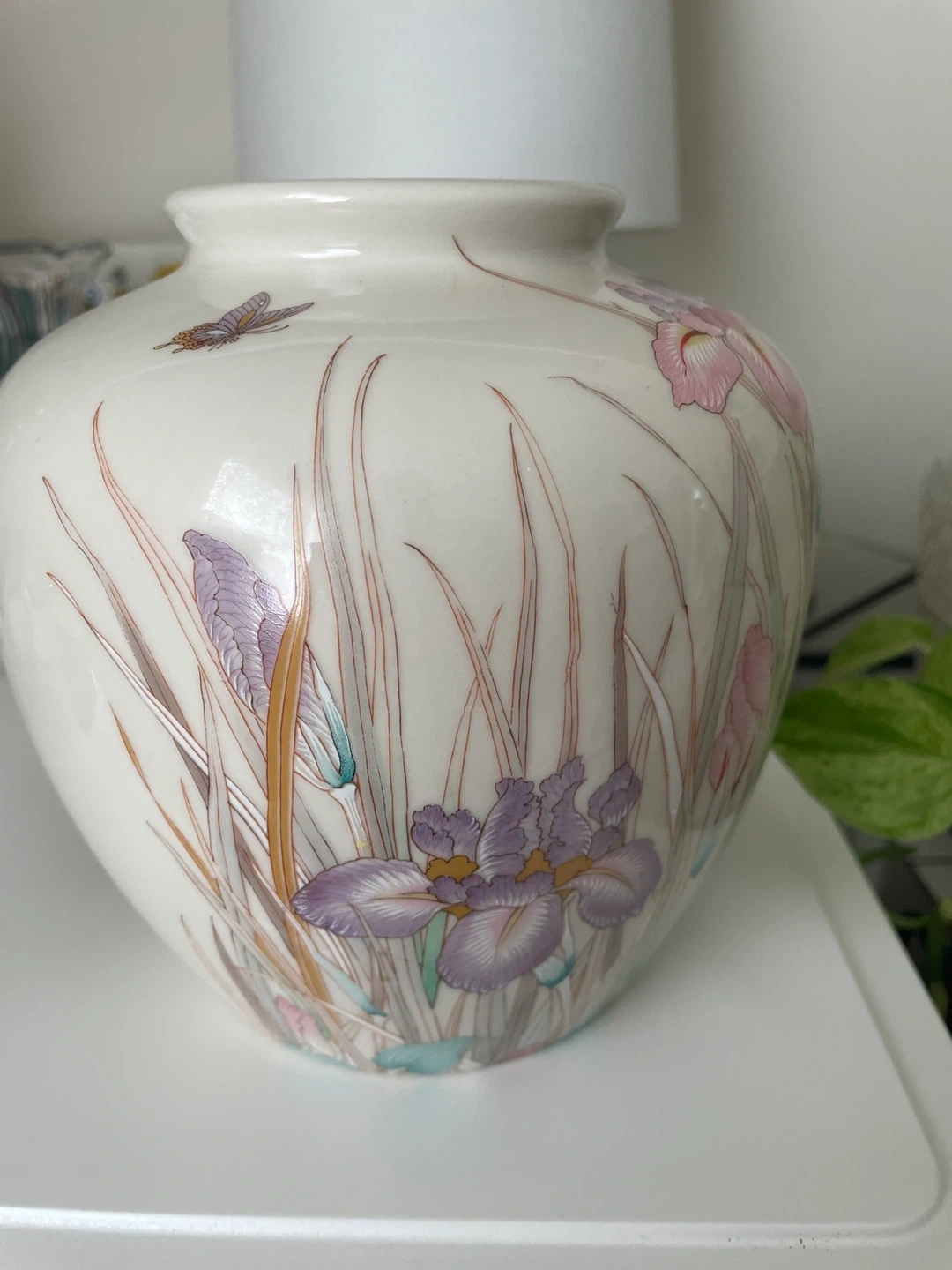 A lovely vintage vase featuring a hand painted iris and butterfly design. Ceramic glazed, perfect condition. Made in Japan.