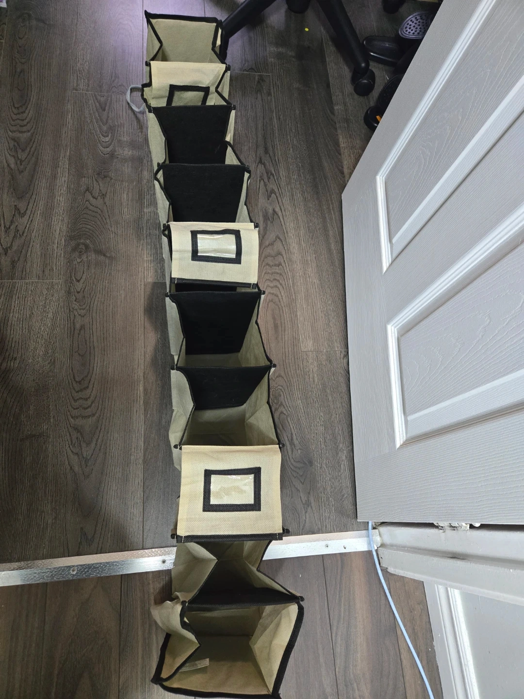 This hanging storage organizer has eight individual pockets. It's made of a durable fabric material. Great for storing shoes, accessories, or small items! 10 convieniant slots to keep you organized and gain more closet space.