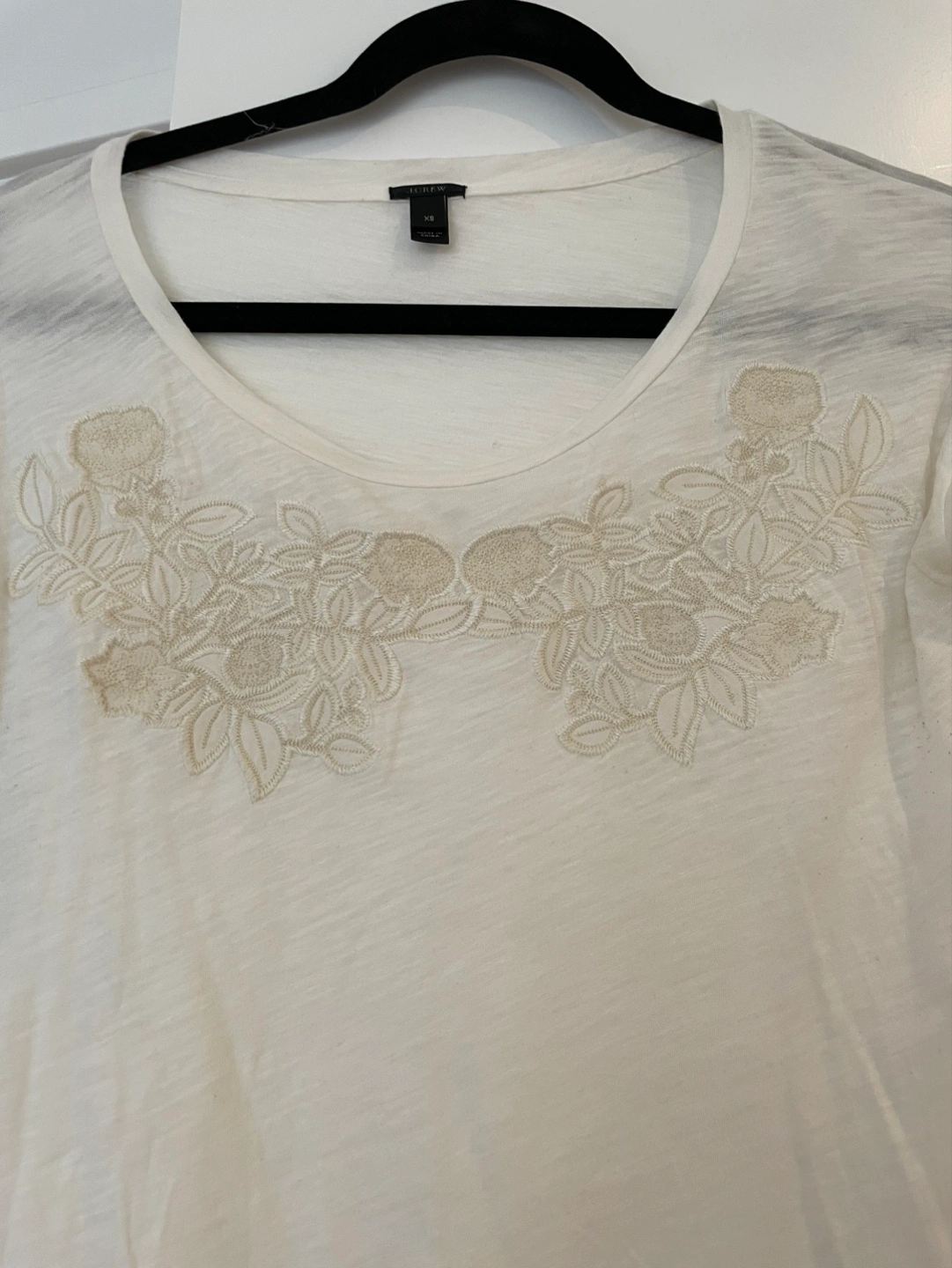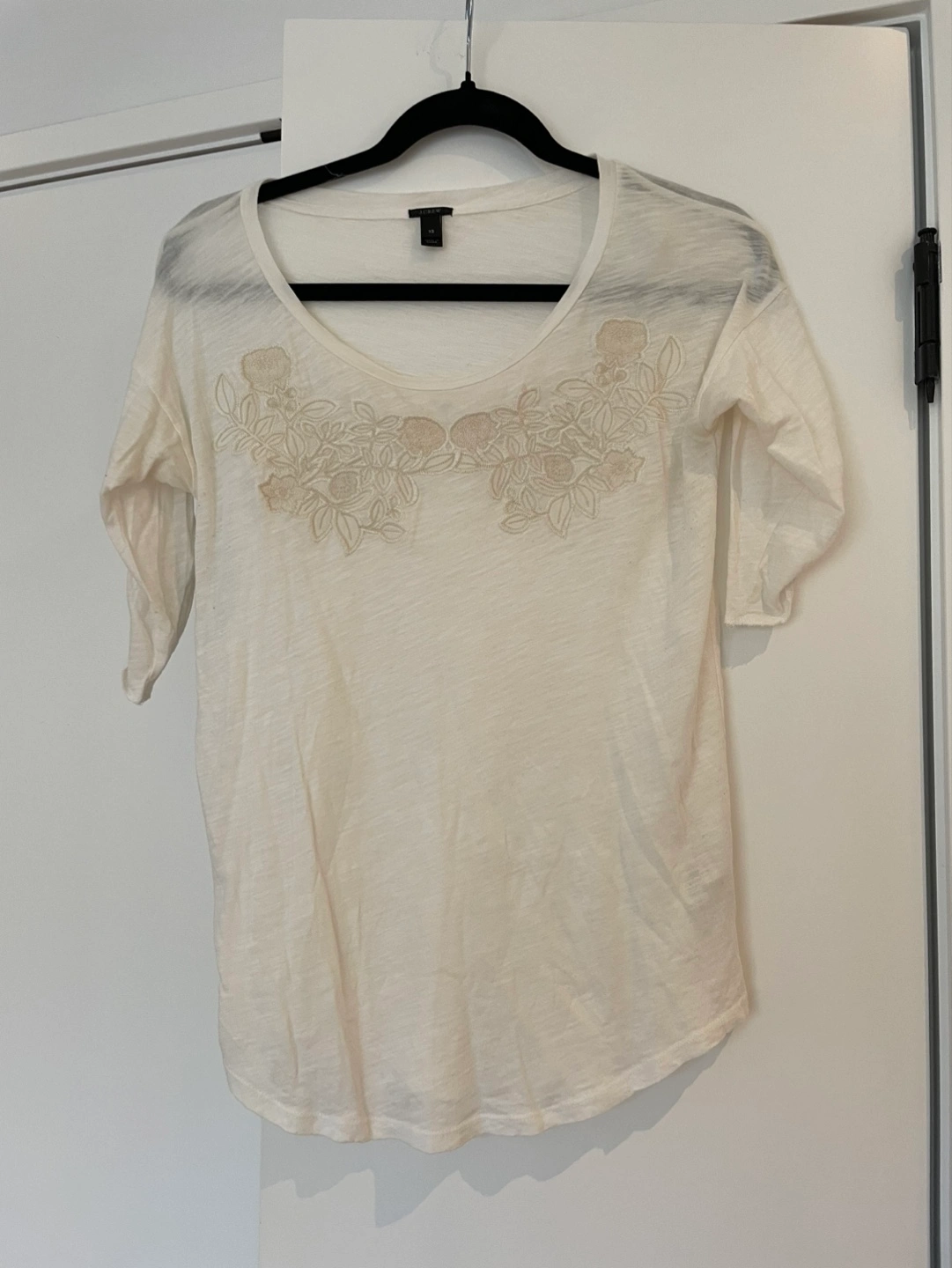 Cream-coloured, short-sleeved top. Features delicate floral embroidery across the chest. Relaxed fit. Size extra small.