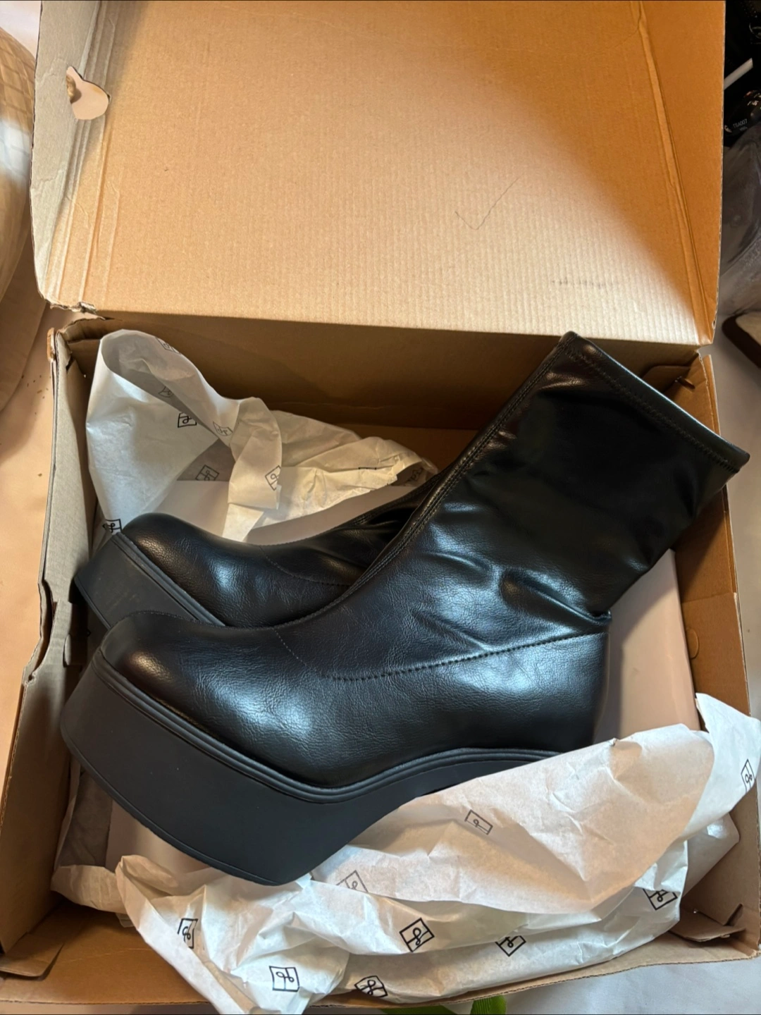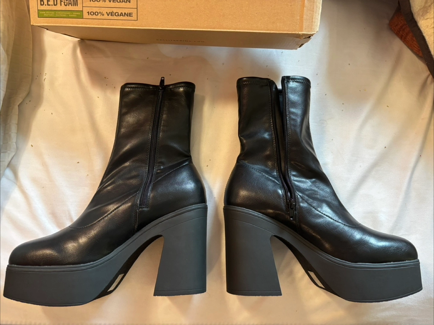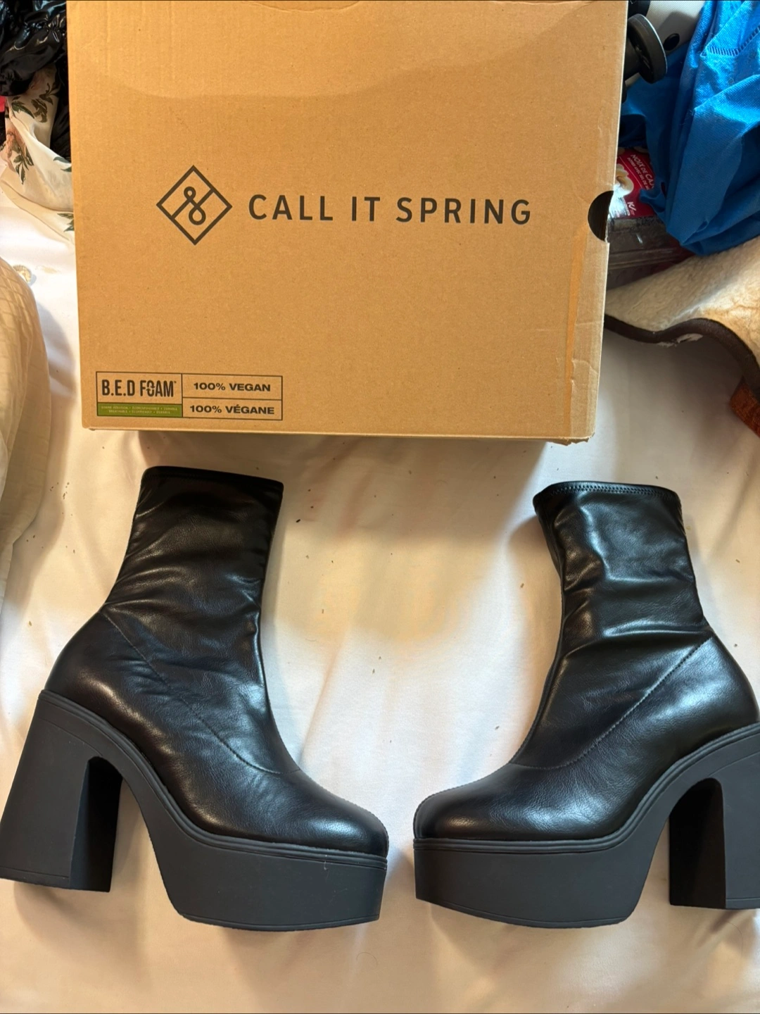 Selling a pair of Call It Spring platform boots in black. They're in great condition and come with the original box! The boots are a US size 10, EUR size 41, and UK size 8. Made with B.E.D Foam and are 100% vegan