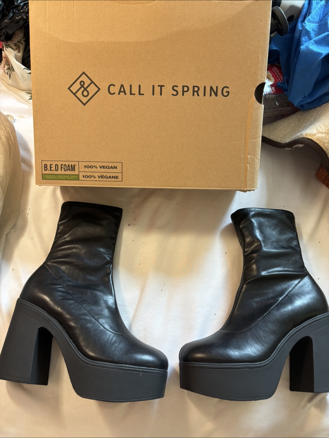 Selling a pair of Call It Spring platform boots in black. They're in great condition and come with the original box! The boots are a US size 10, EUR size 41, and UK size 8. Made with B.E.D Foam and are 100% vegan