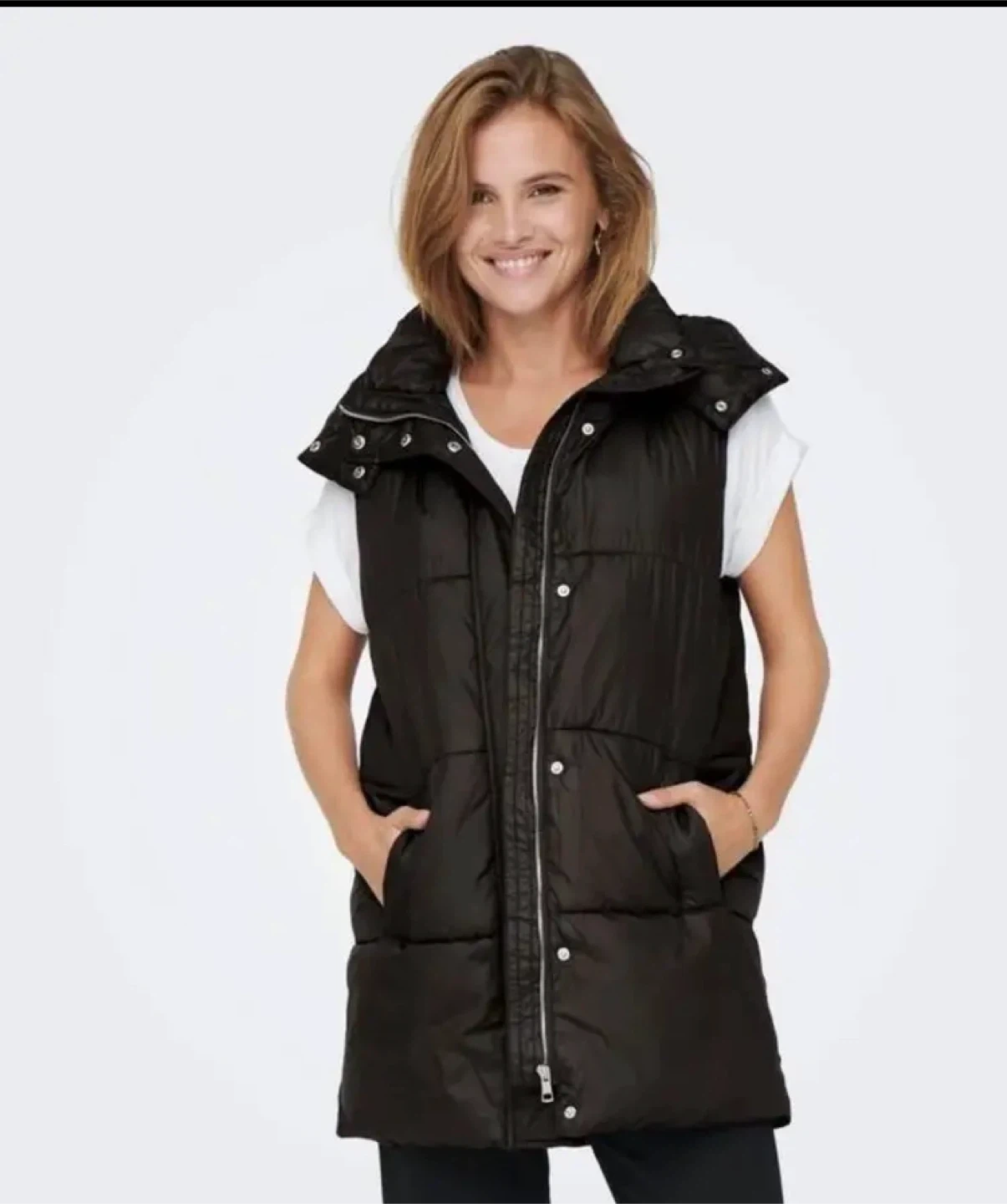 Looking to sell a black puffer vest from ONLY. It's in great condition and perfect for layering during the colder months! The vest features a full zip closure and a hooded design. It's a stylish and practical addition to any wardrobe