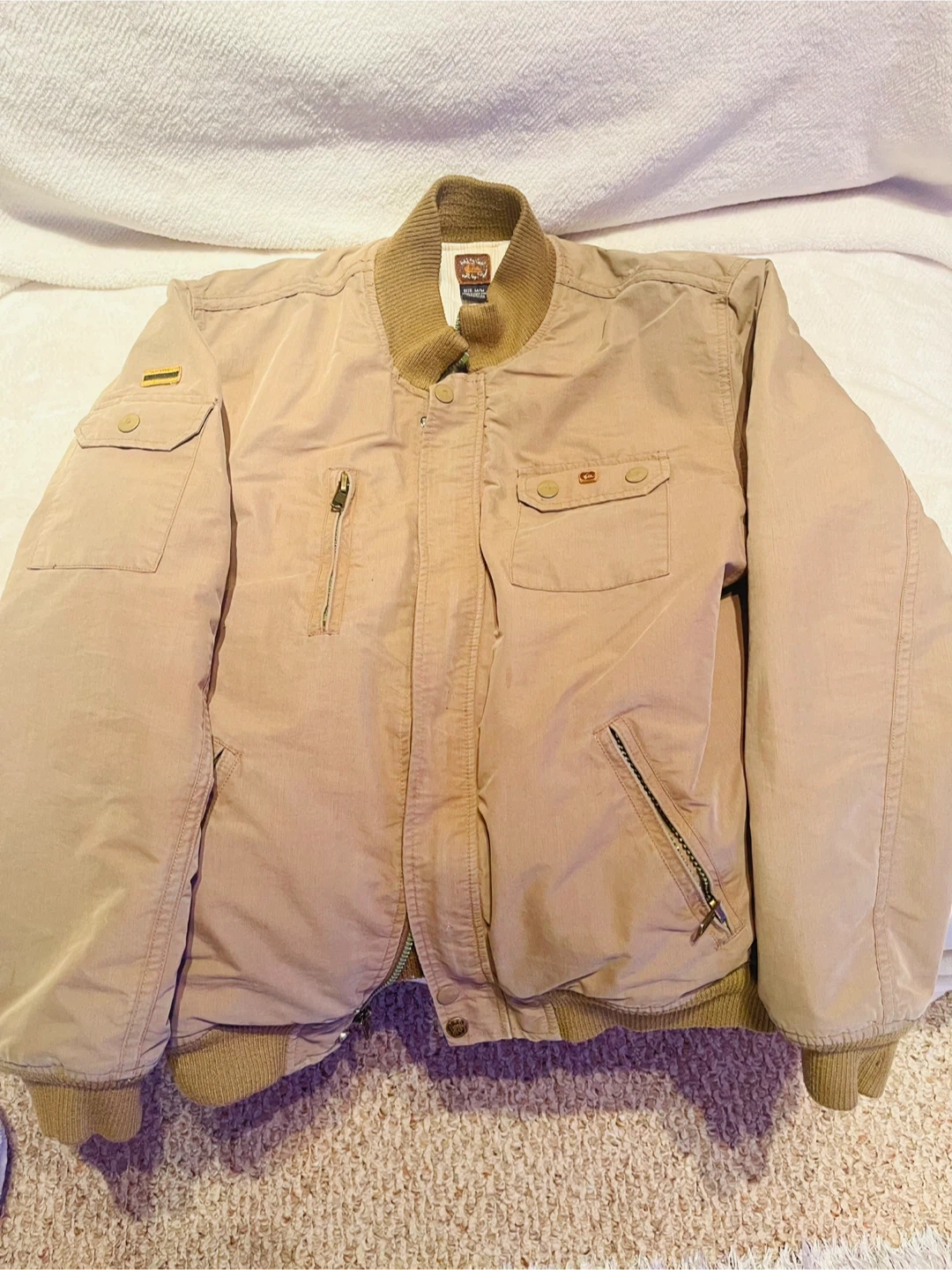 This is a tan bomber jacket in size M/M. It's made in Hong Kong. It has multiple zippered and buttoned pockets.