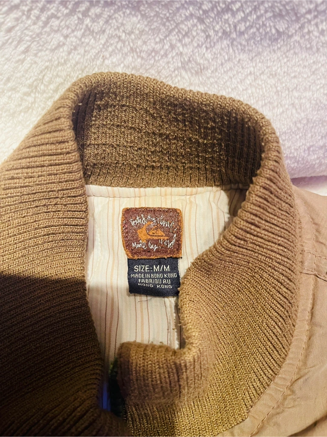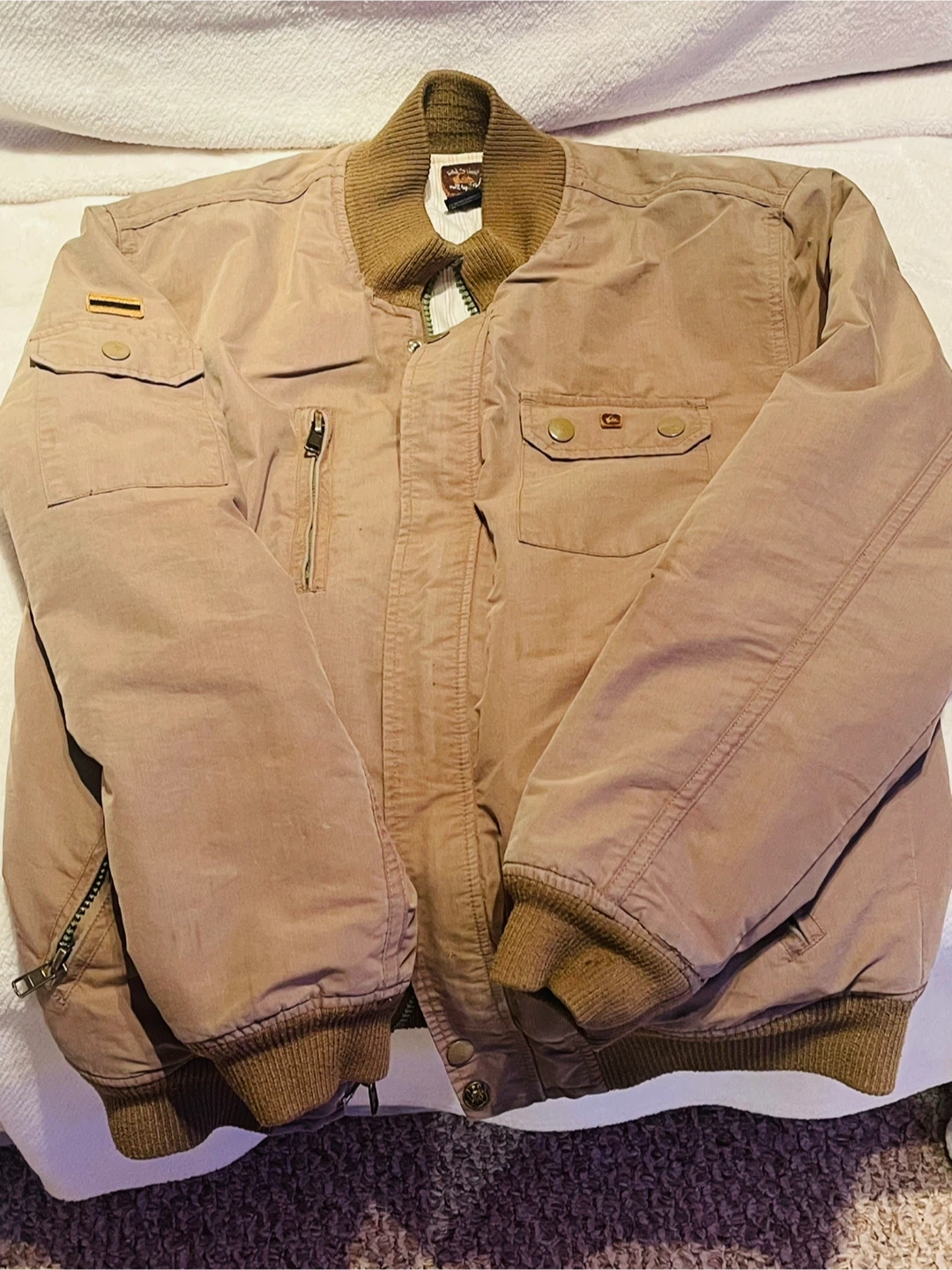 This is a tan bomber jacket in size M/M. It's made in Hong Kong. It has multiple zippered and buttoned pockets.