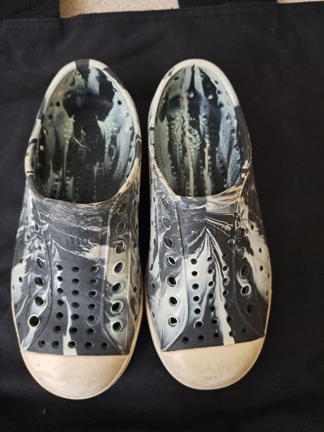 These Native shoes have a unique marbled black and white pattern. They're made from lightweight, durable EVA material. Waterproof and easy to clean, perfect for active kids!
