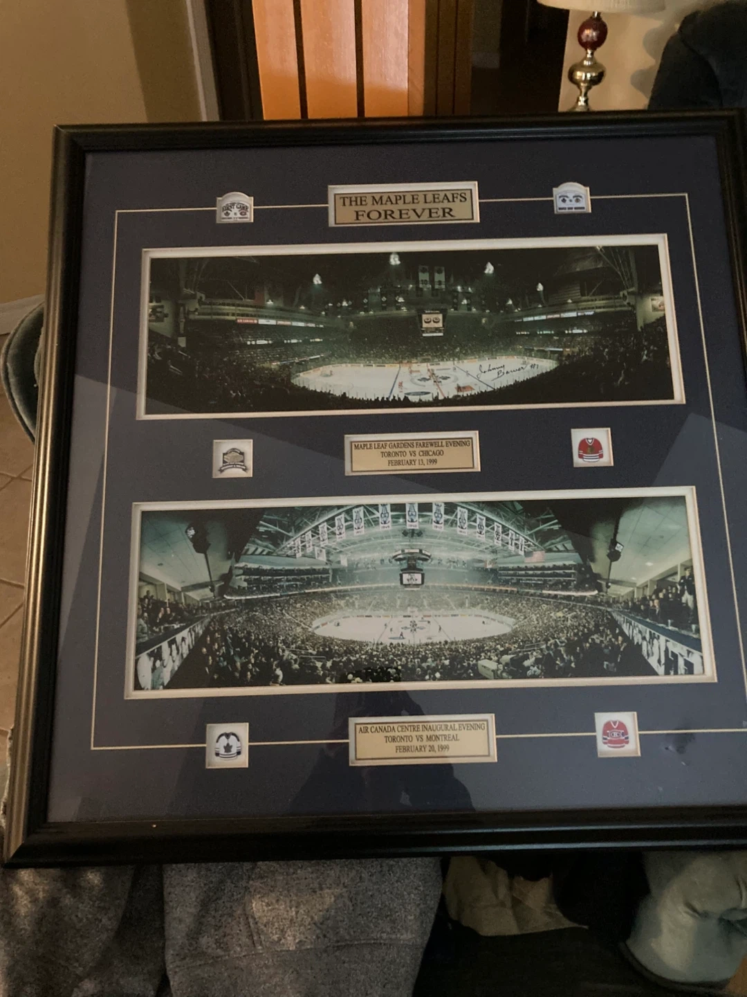 Framed memorabilia celebrating "The Maple Leafs Forever" with images from the Maple Leafs Gardens Farewell Evening and Air Canada Centre Inaugural Evening. Includes a certificate of authenticity from Wildraz Sports Collectibles. This piece showcases significant moments in Toronto Maple Leafs history.