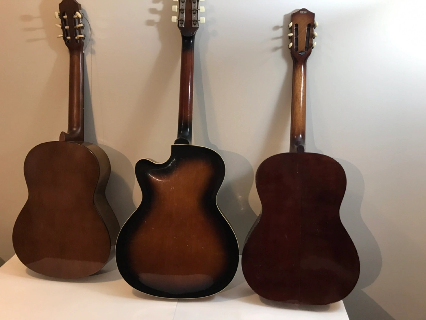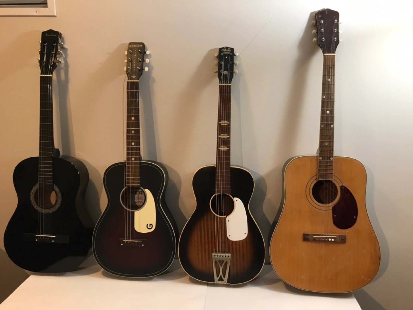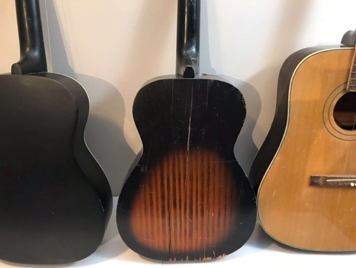Set of 7 vintage and retro acoustic guitars. Some wear and tear is present on the guitars, some have damage would need repair . Some are in playable condition. Would make great decor in a home or music room. 5 guitar cases included .