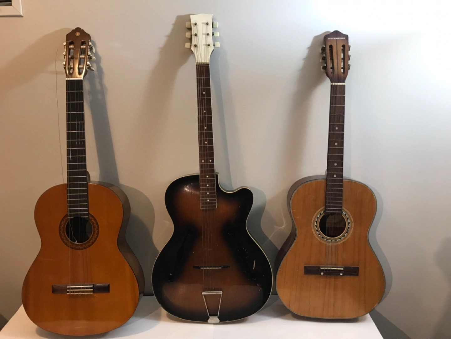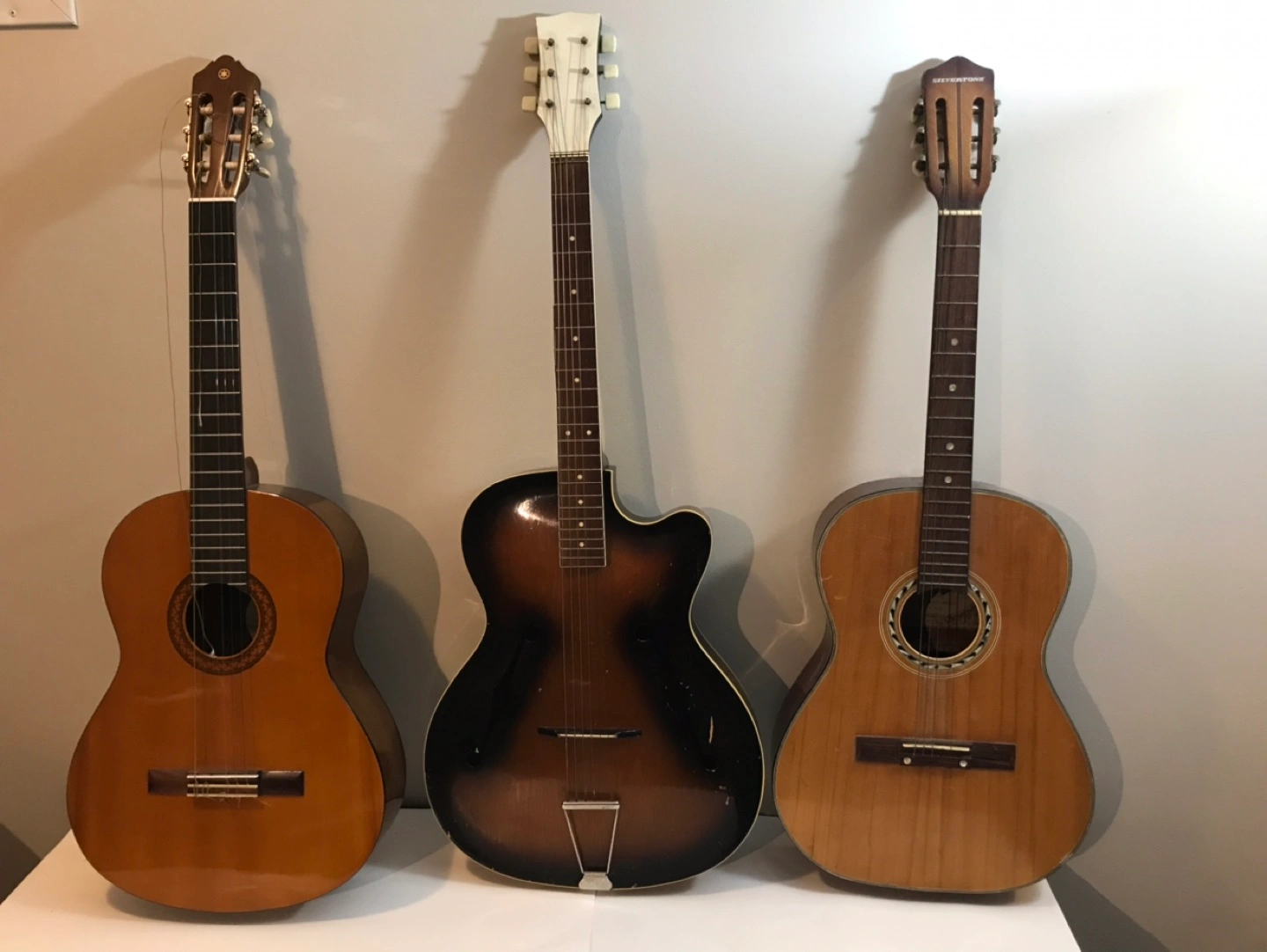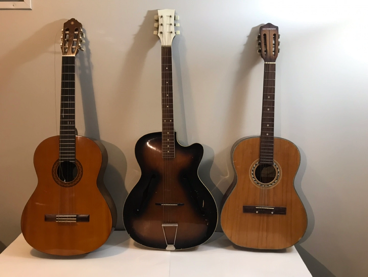 Set of 7 vintage and retro acoustic guitars. Some wear and tear is present on the guitars, some have damage would need repair . Some are in playable condition. Would make great decor in a home or music room. 5 guitar cases included .