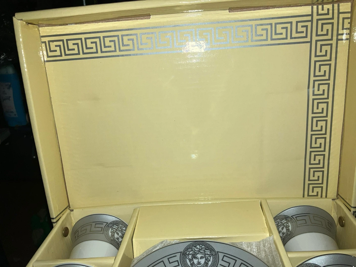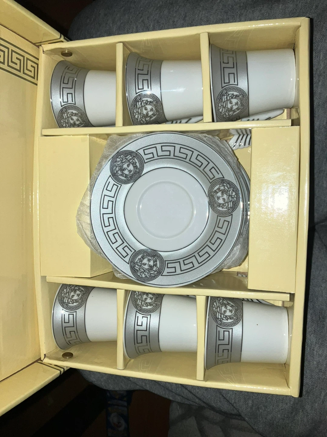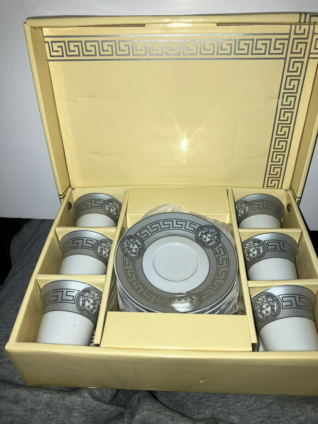 Set of six espresso cups and saucers with a decorative Greek key and Medusa head design. White ceramic with silver accents. Comes in original box.