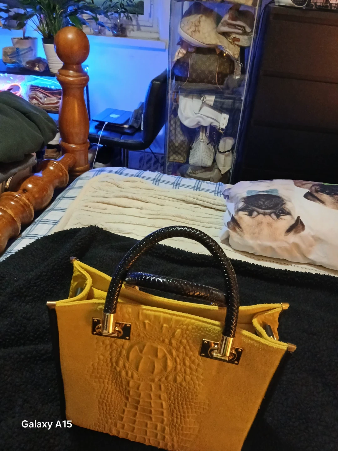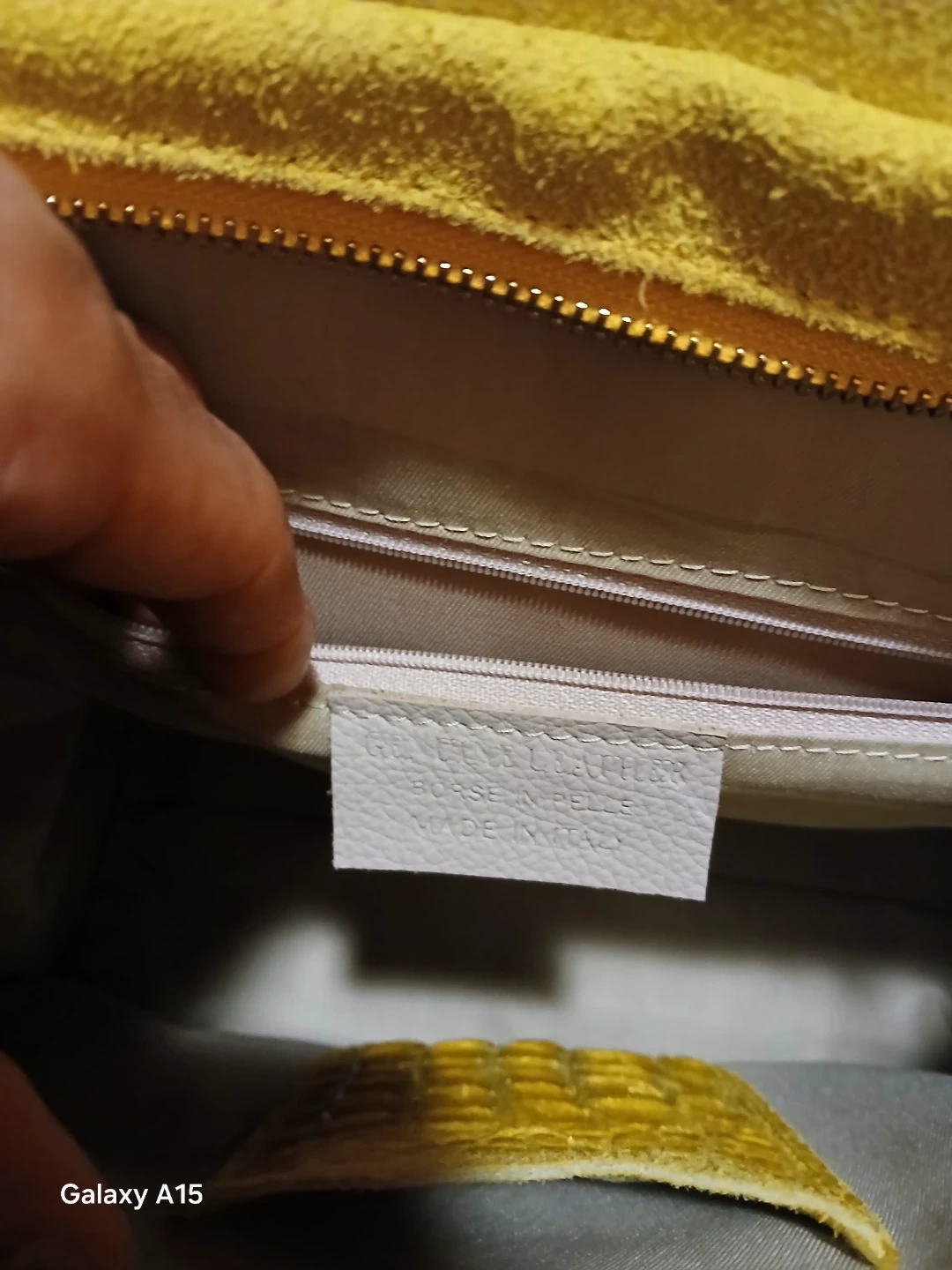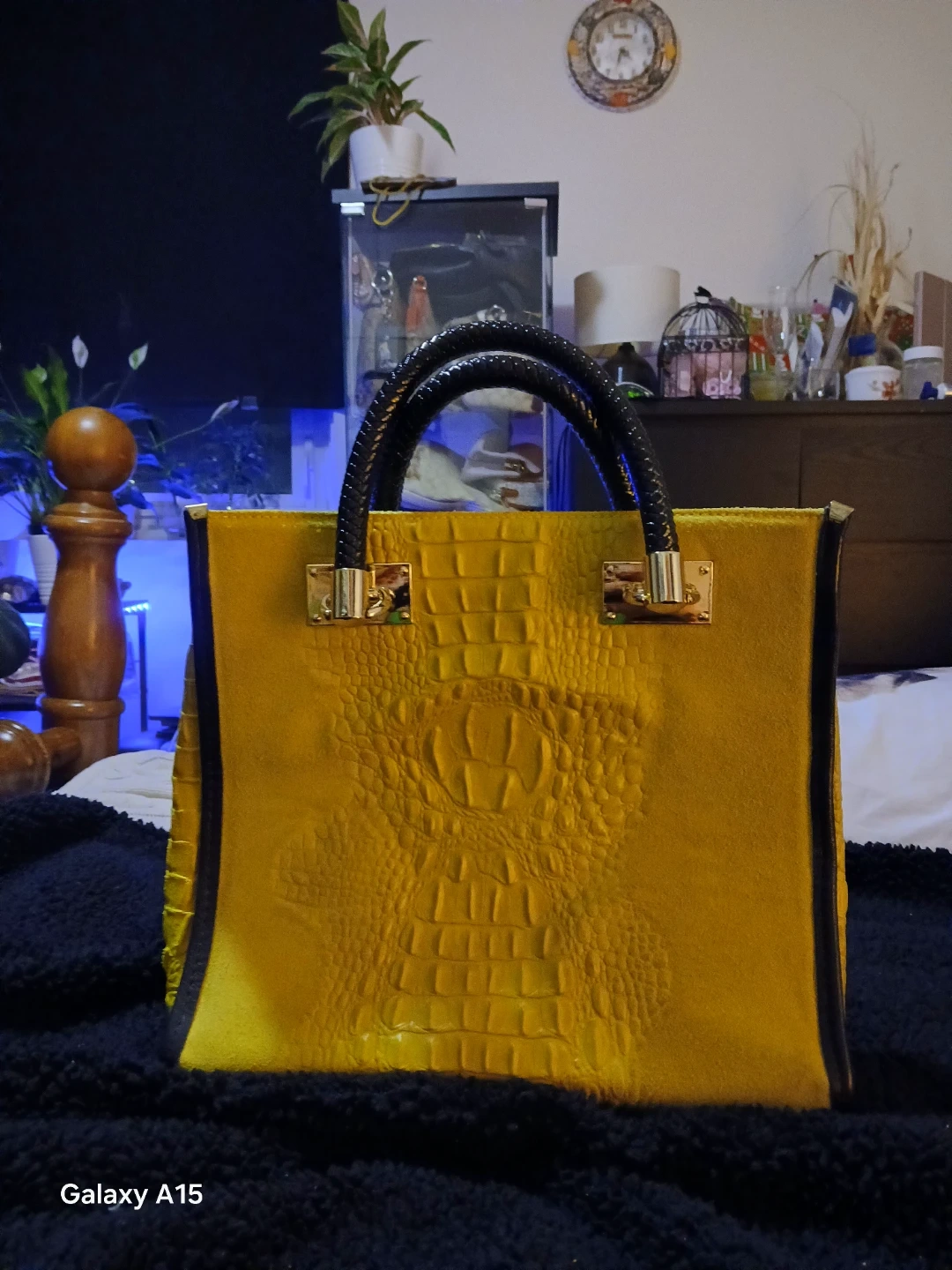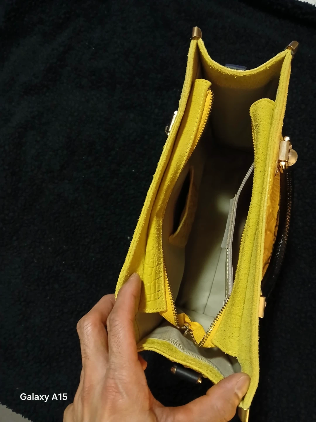 This Light Green tote bag features a croc embossed leather front. It's made in Italy and has a suede interior. The bag includes black faux leather handles with gold hardware.