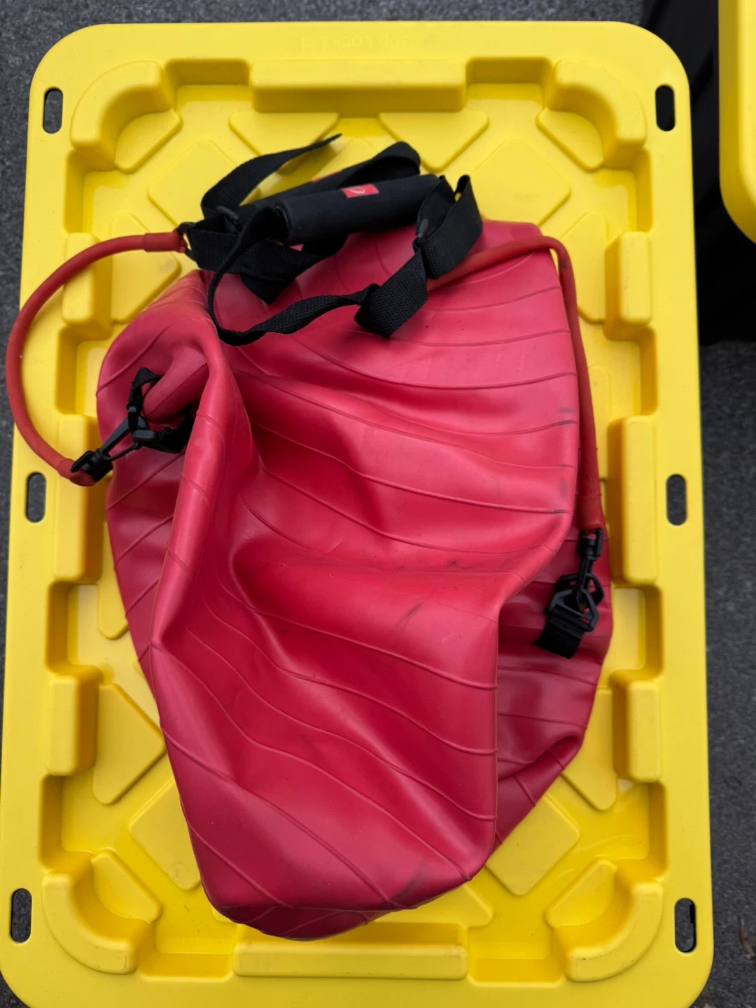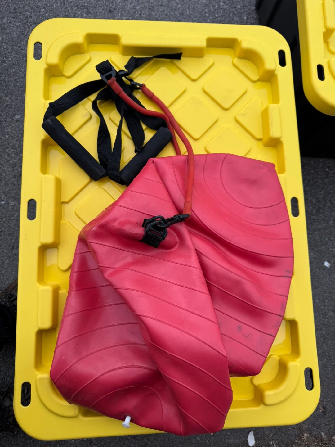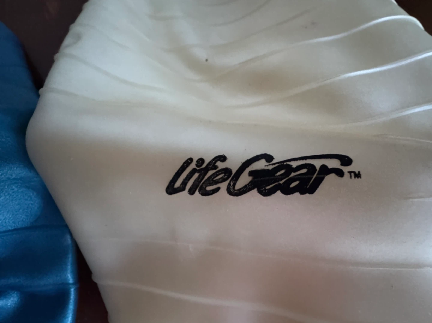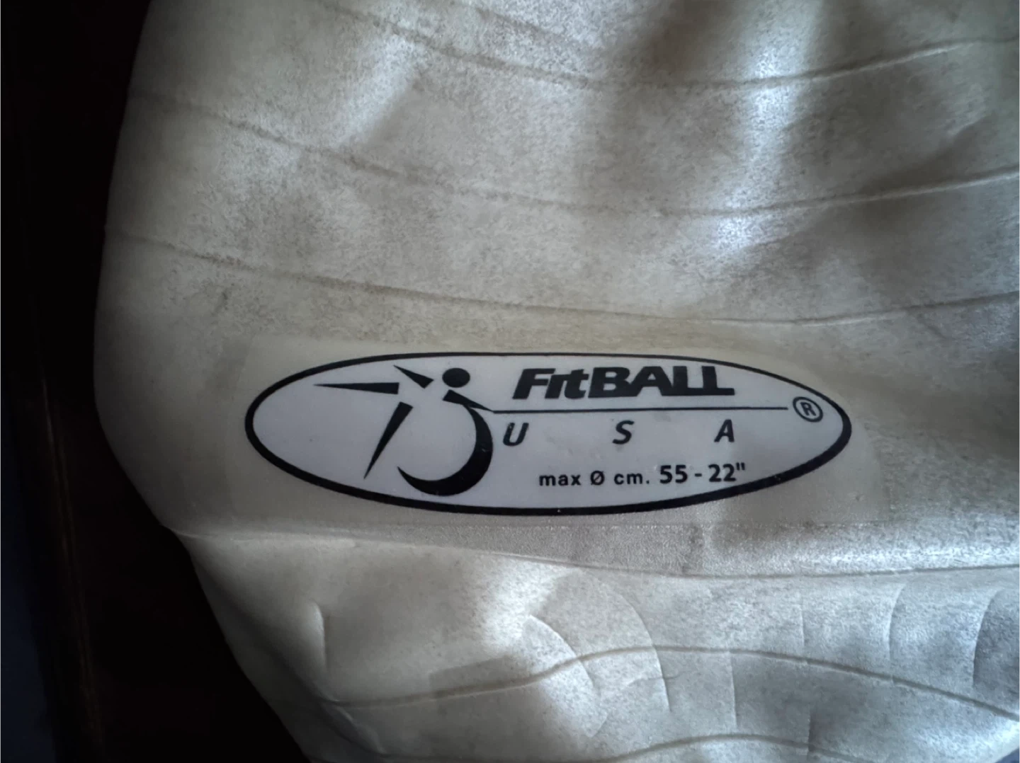 The blue ball has "FitBALL USA" branding, and the white ball also says "FitBALL U S A". The cream ball has life gear brand on it. One red ball with black handles and straps is also available and is branded "Bally Total Fitness". Located in Penticton