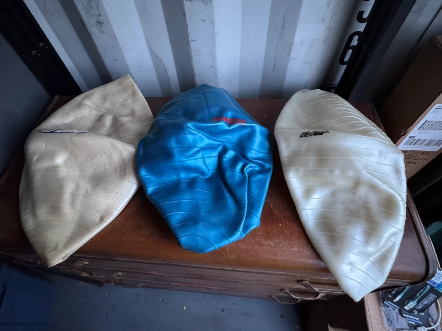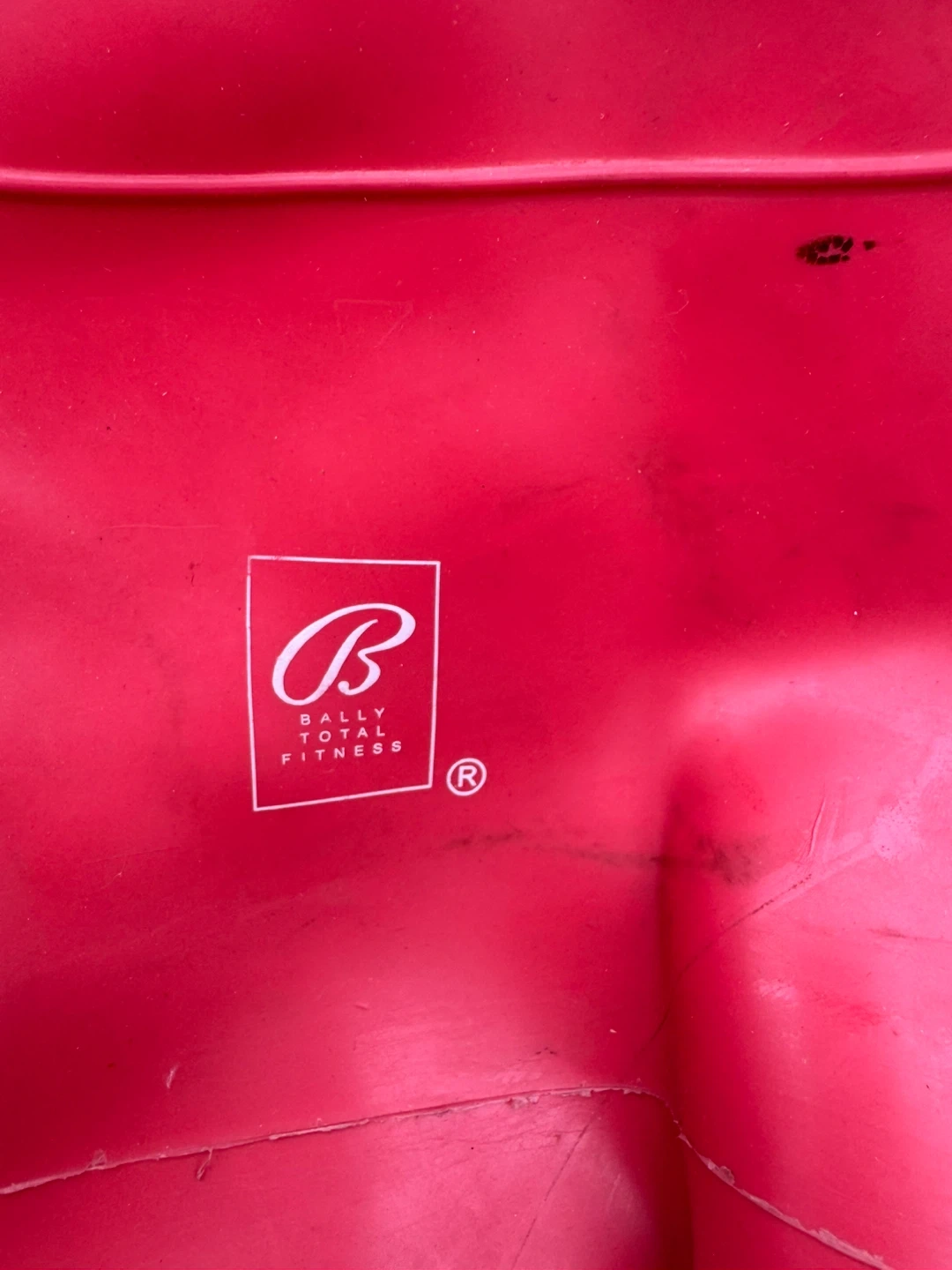 The blue ball has "FitBALL USA" branding, and the white ball also says "FitBALL U S A". The cream ball has life gear brand on it. One red ball with black handles and straps is also available and is branded "Bally Total Fitness". Located in Penticton