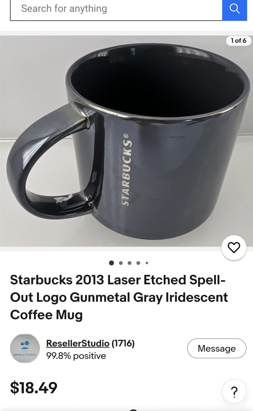 A Starbucks 2013 coffee mug with a laser etched spell-out logo. It's gunmetal gray with an iridescent finish. Dishwasher and microwave safe.