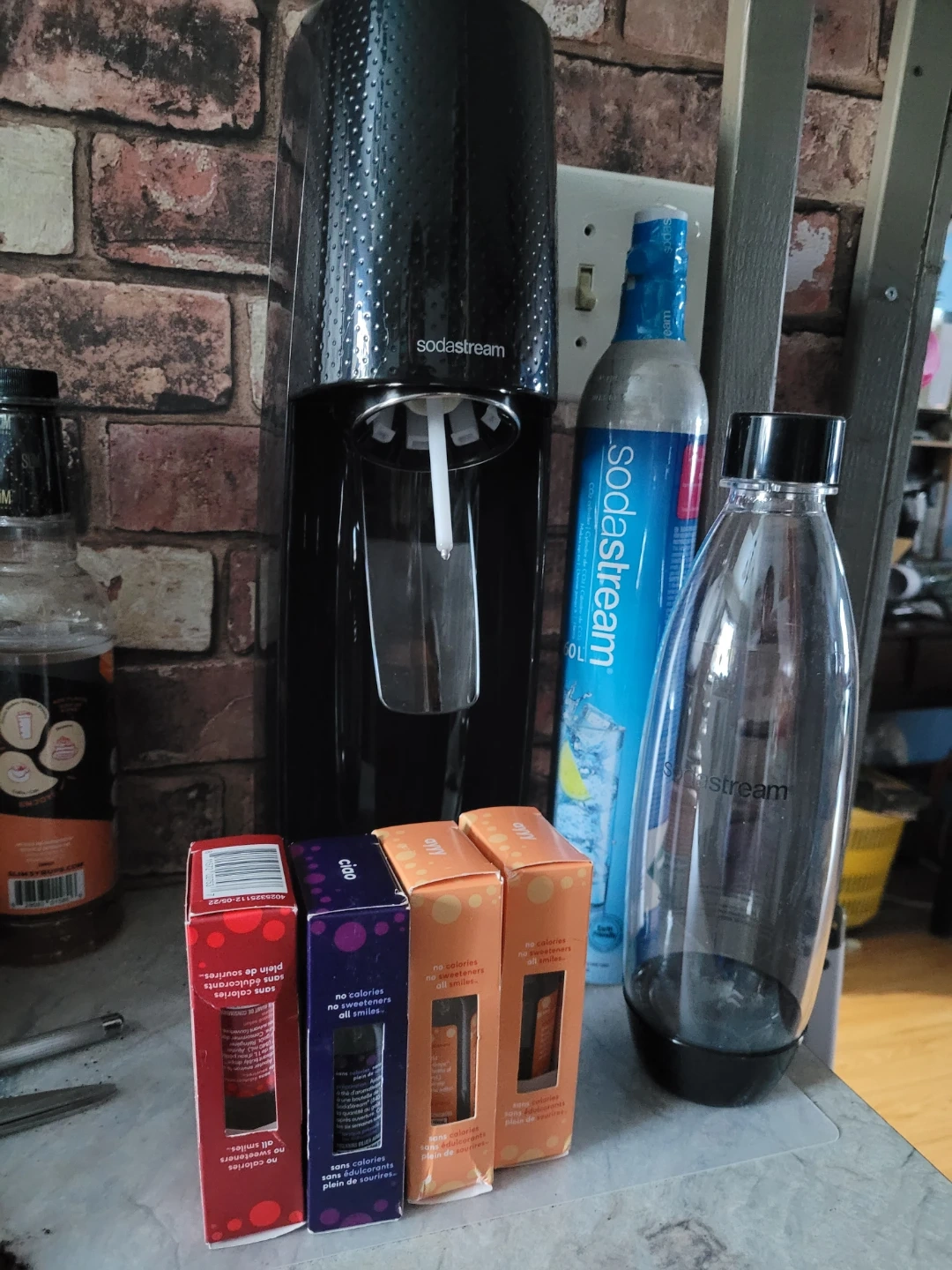 This SodaStream comes with the machine, a CO2 cylinder, and a reusable bottle. It also includes four flavour bottles: two 'ciao' and two 'all smiles' in orange and purple boxes. The flavours are no calorie, no sweetener, and all smiles!