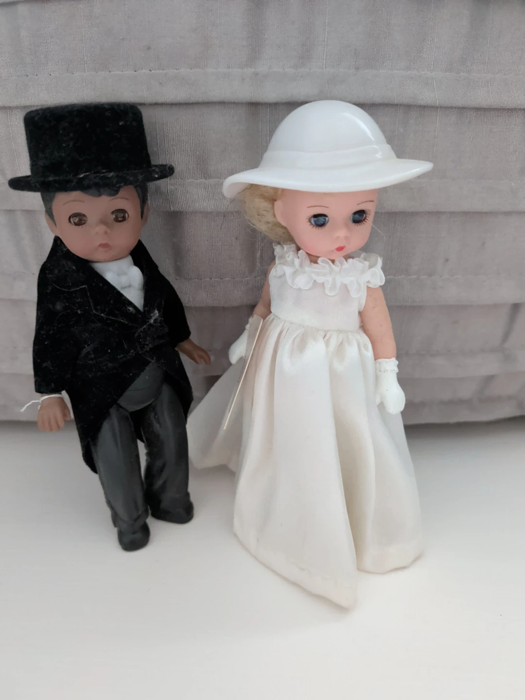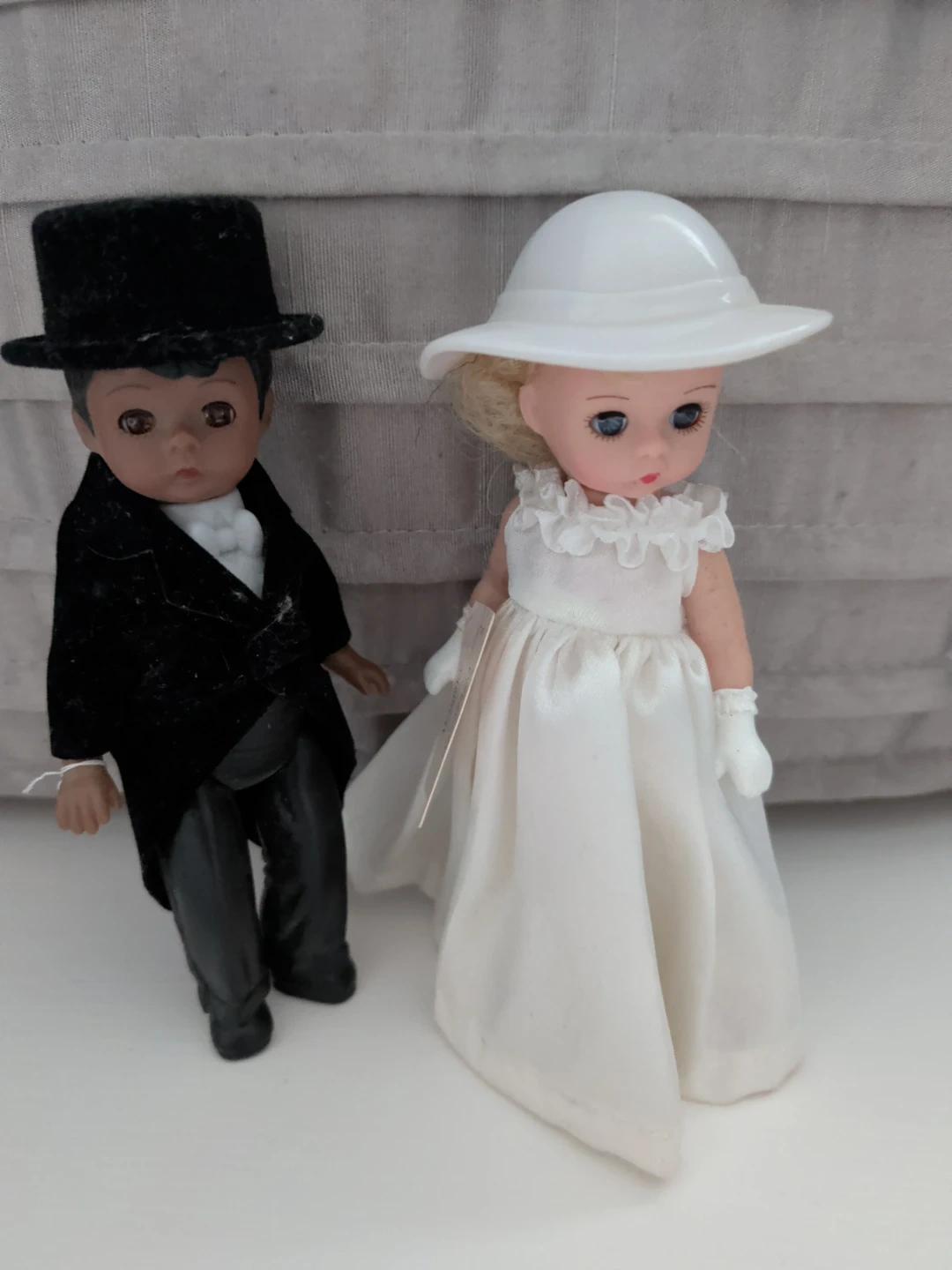 A pair of vintage wedding dolls, one in a tuxedo and the other in a wedding gown. The bride doll wears a white dress with a ruffled neckline and matching gloves. The groom doll is dressed in a black tailcoat and top hat. These dolls would be a lovely addition to a collection or for display.