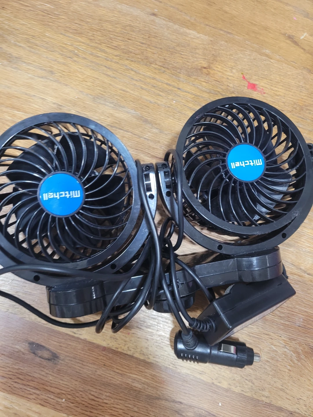 Double Mitchell brand car fans, black colour. These plug into your car's 12V outlet. They're great for keeping the air circulating on a hot day!