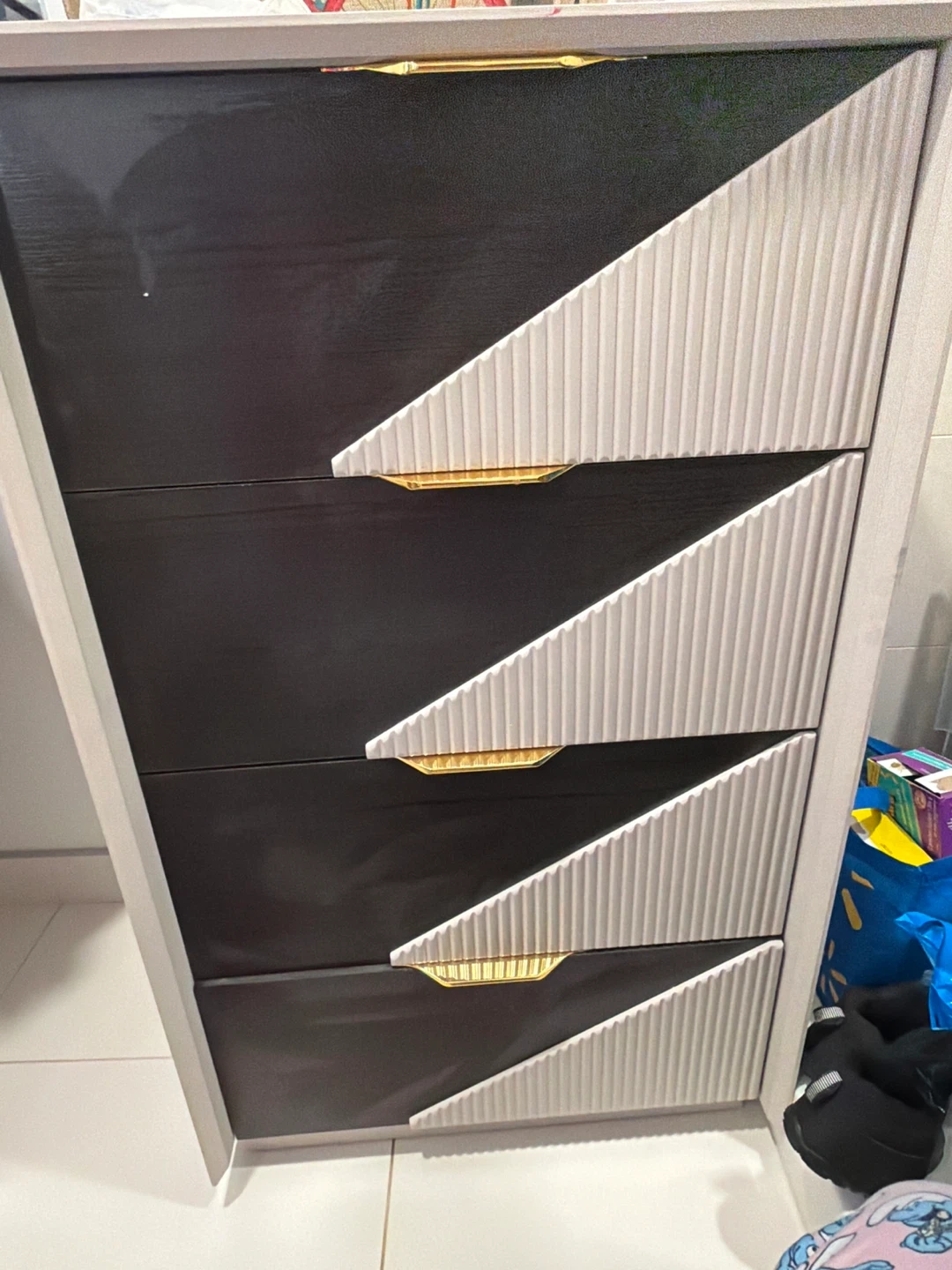Stylish four-drawer dresser with a modern design! Features a striking black and white colour scheme with unique geometric detailing on the drawer fronts and gold coloured handles. Perfect for adding a touch of contemporary elegance to any bedroom