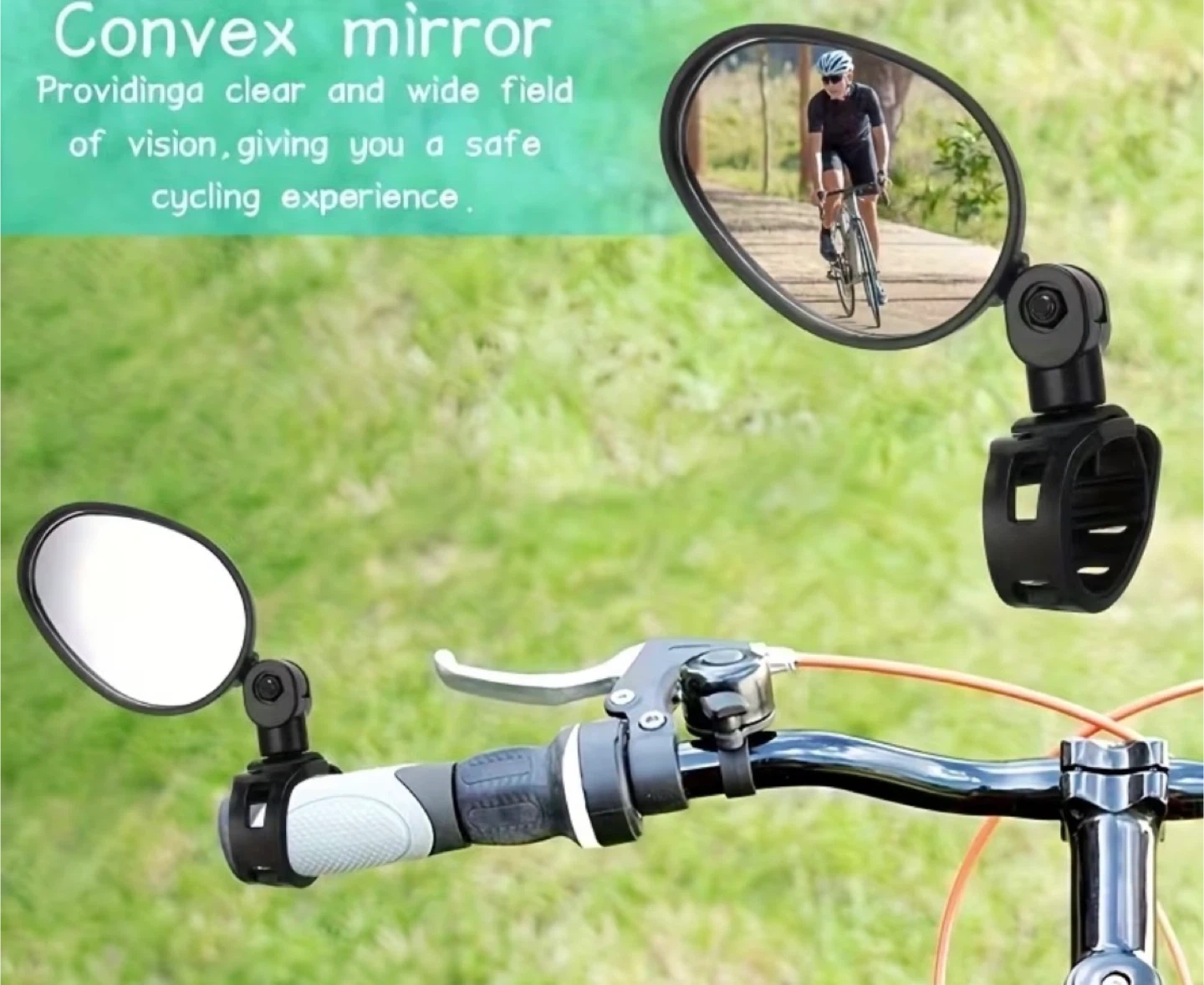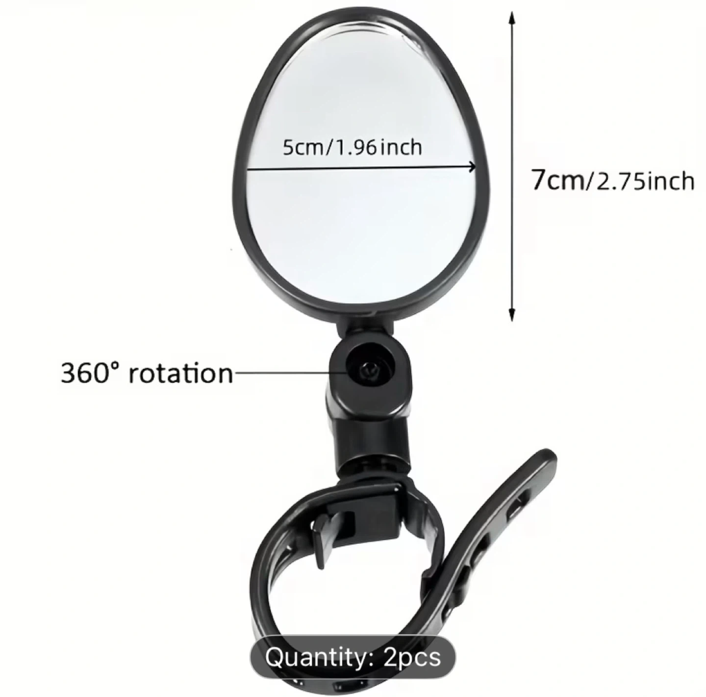 Set of 2 convex bicycle mirrors. Each mirror is 5cm wide and 7cm long. They offer 360° rotation for adjustable viewing. This mirror provides a clear and wide field of vision for a safer cycling experience.