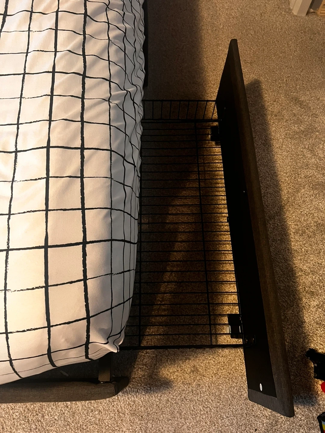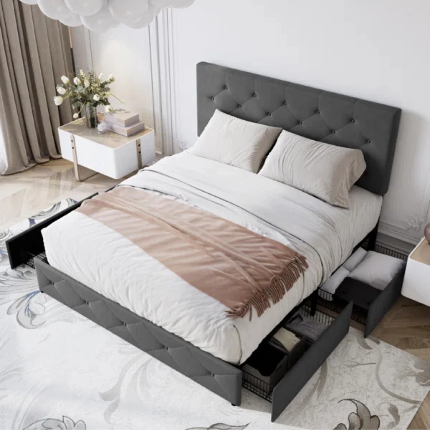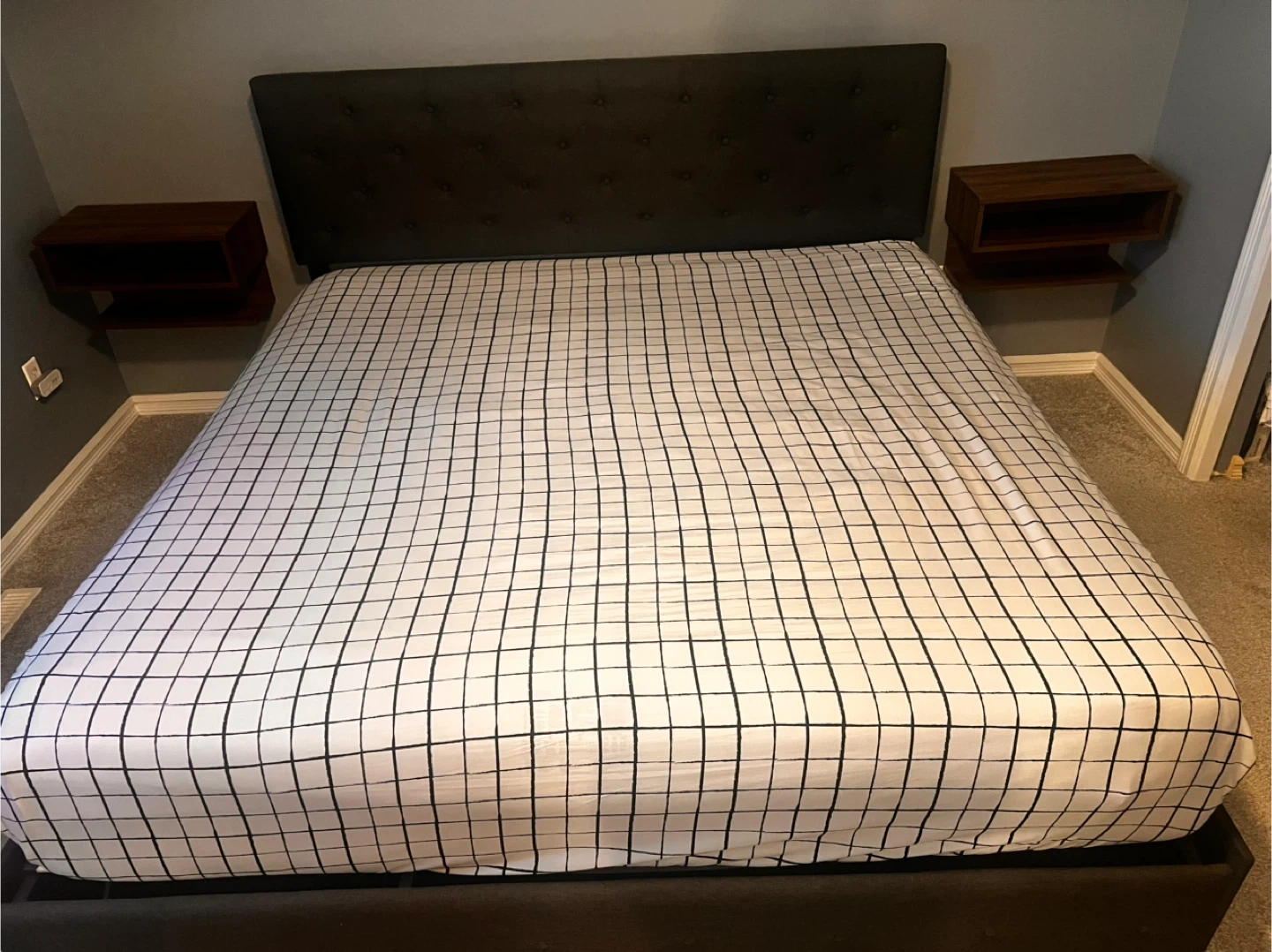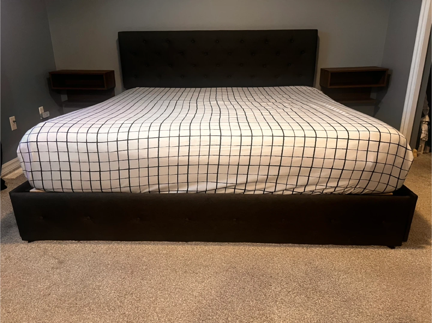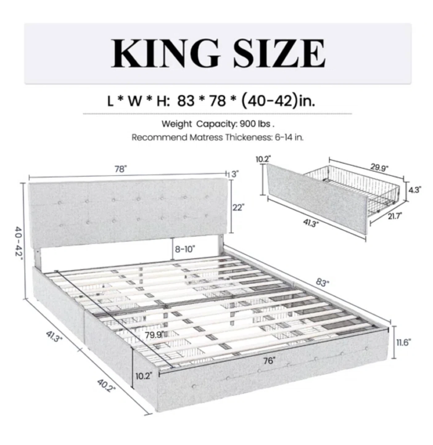 Selling a king size bed frame, complete with handy storage drawers! The dimensions are 83" x 78" (40-42)". It's a great way to maximize space in your bedroom. The weight capacity is 900 lbs, and a mattress thickness of 6-14 inches is recommended