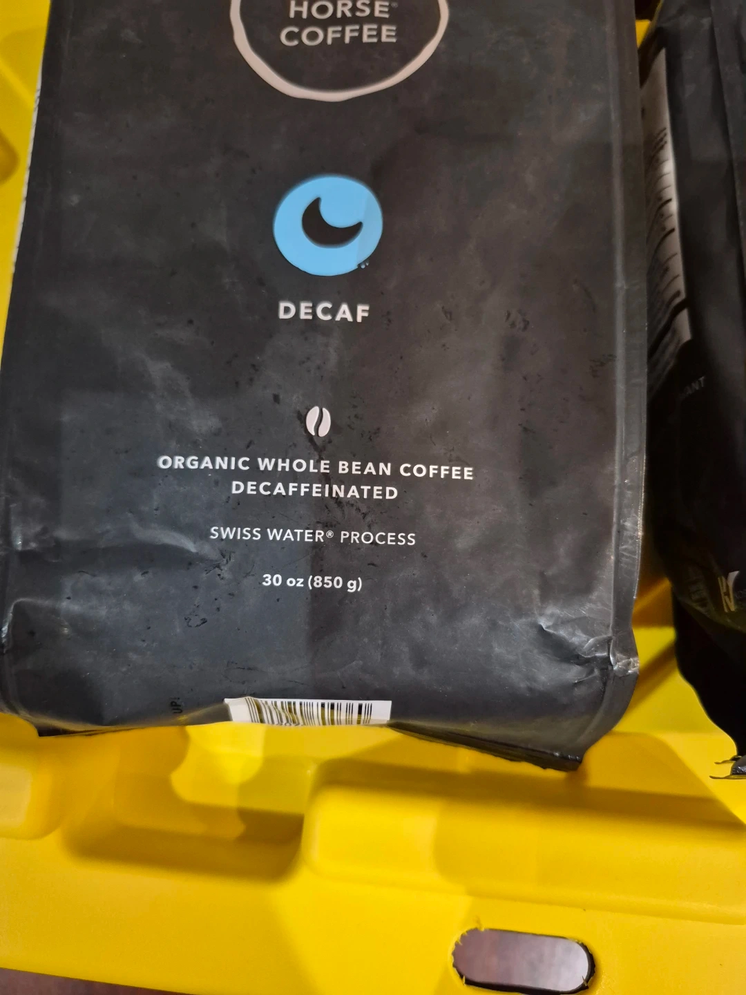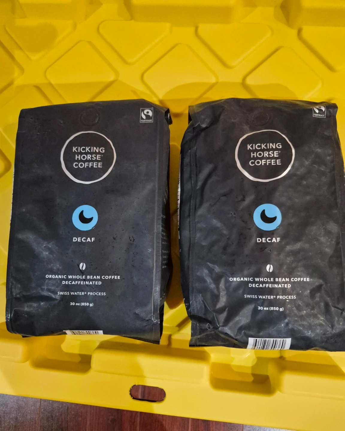 Enjoy Kicking Horse Coffee's organic whole bean decaf coffee. It's decaffeinated using the Swiss Water Process. Each bag contains 30 oz (850 g) of coffee beans. Best enjoyed by December 17, 2025. $15 each.