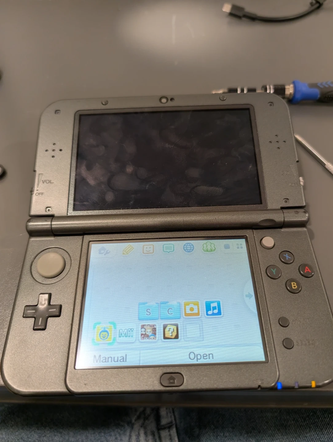 New 3DS XL, top screen powers on but does not display anything, right speaker has detached and requires soldering, home button does not work, shell is scratched up and chipped. I would only recommend buying if you are familiar with repairing or are going to take it to a repair shop. Powers on, all buttons except home button are functional, and the bottom screen works. Stylus included, and a larger battery that I installed a while ago before it broke.