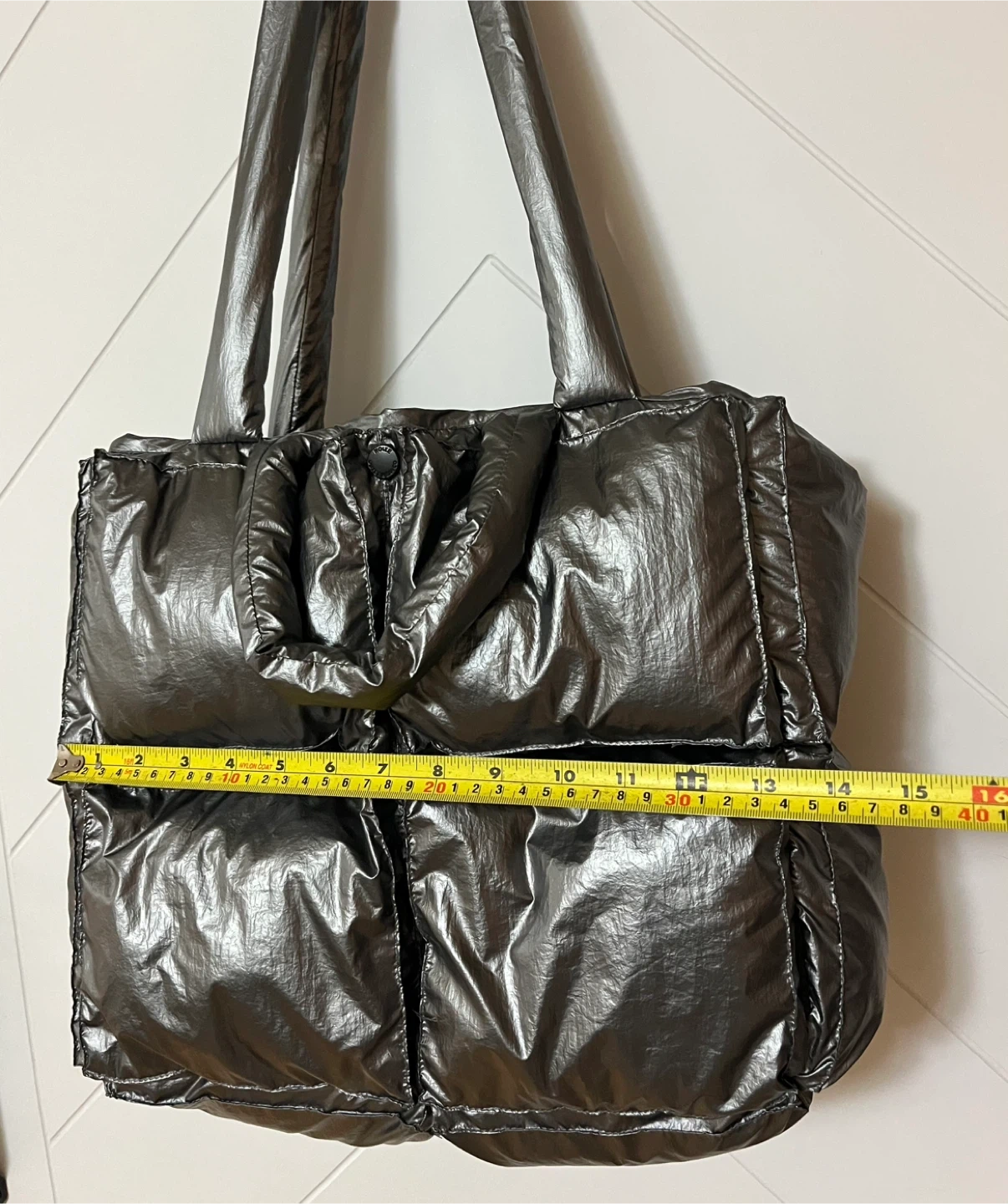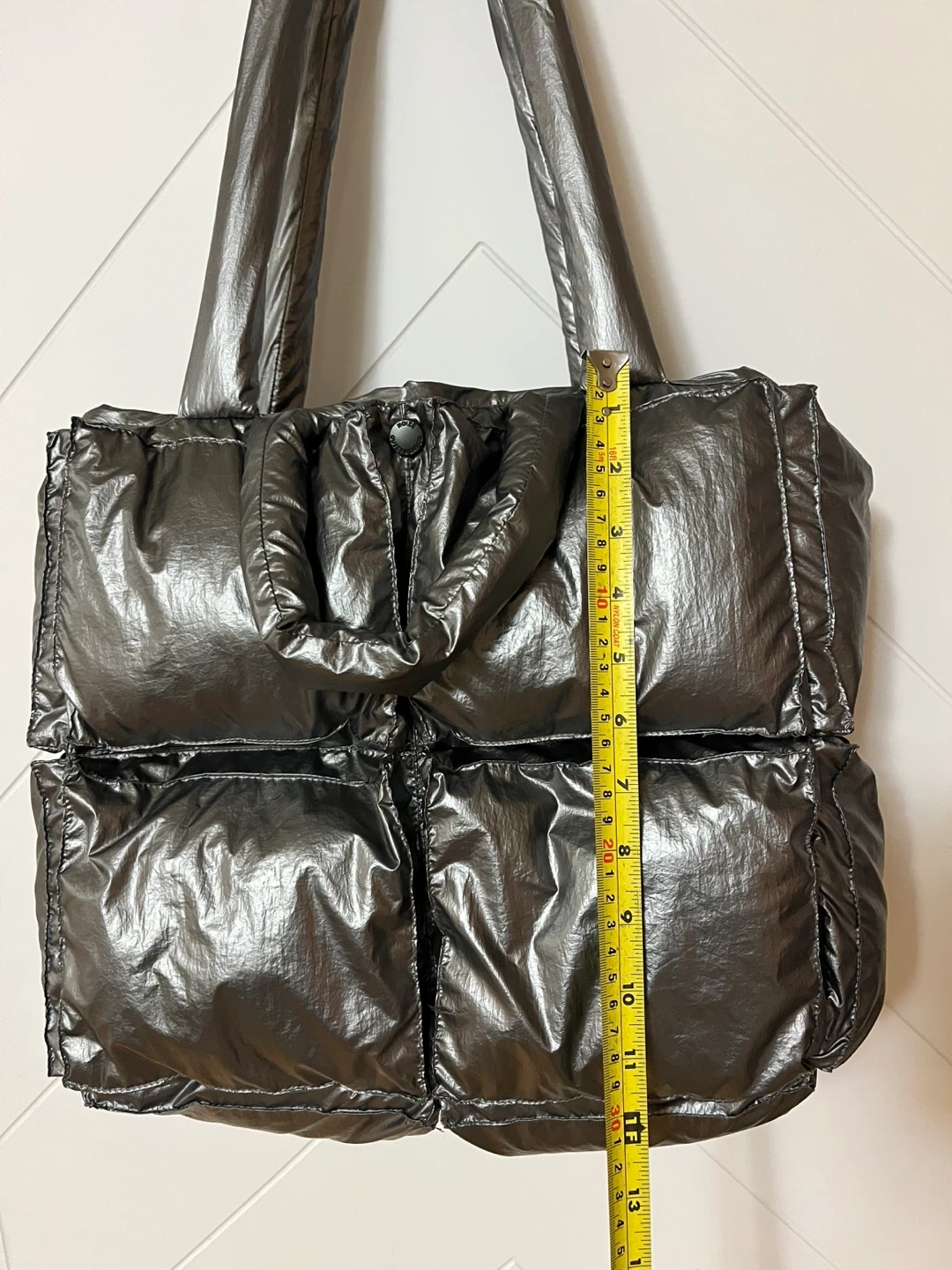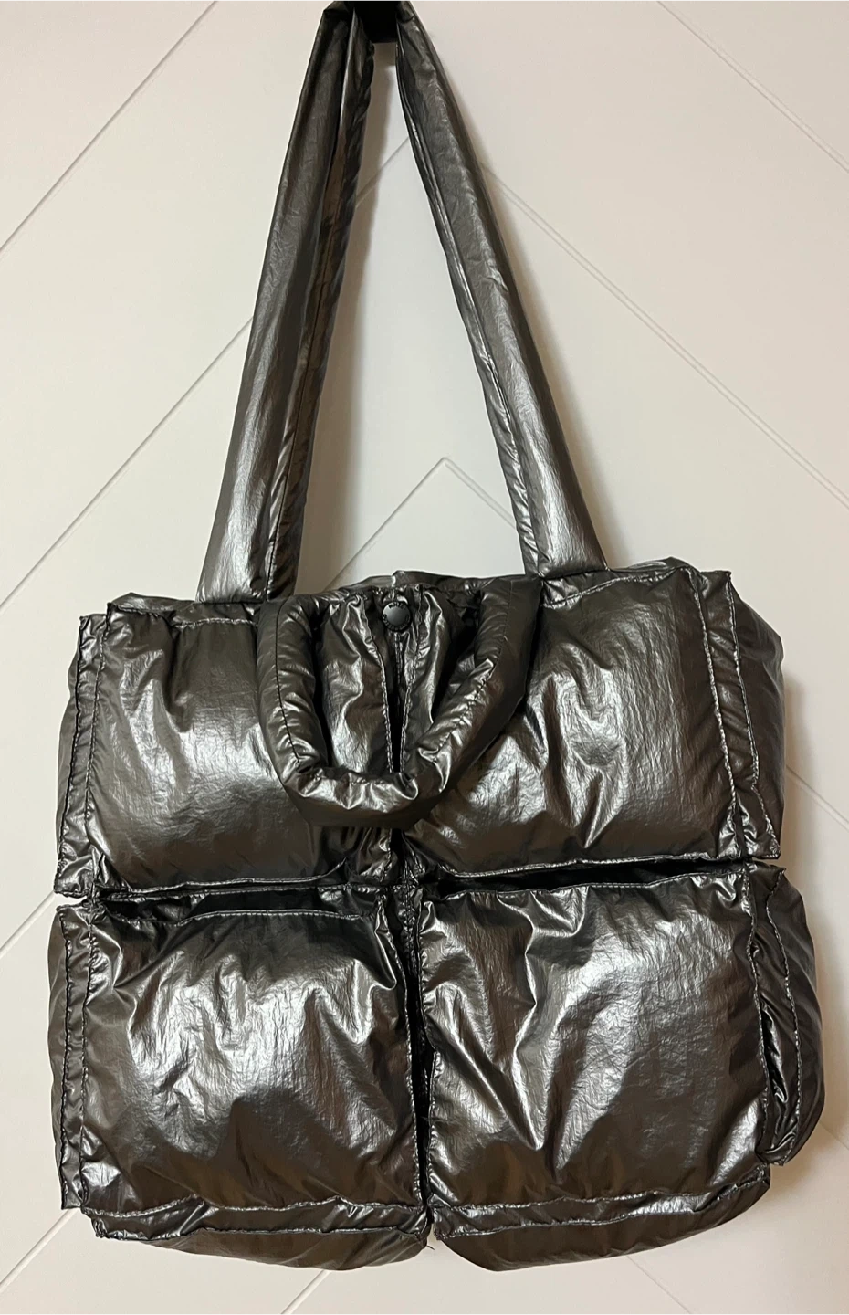 Puffer tote bag with a metallic silver finish