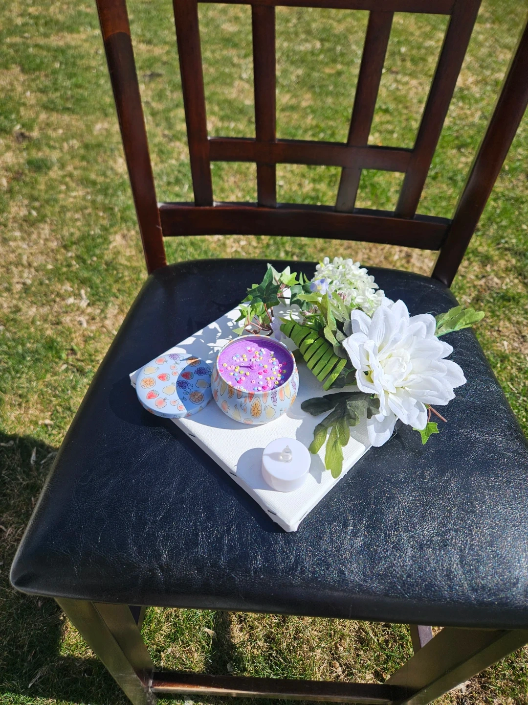 This set includes a small decorative candle in a tin with a lid, accented with artificial flowers and greenery. It's a lovely piece for adding a touch of charm to any space. The candle itself is scented and sprinkled with decorative elements.