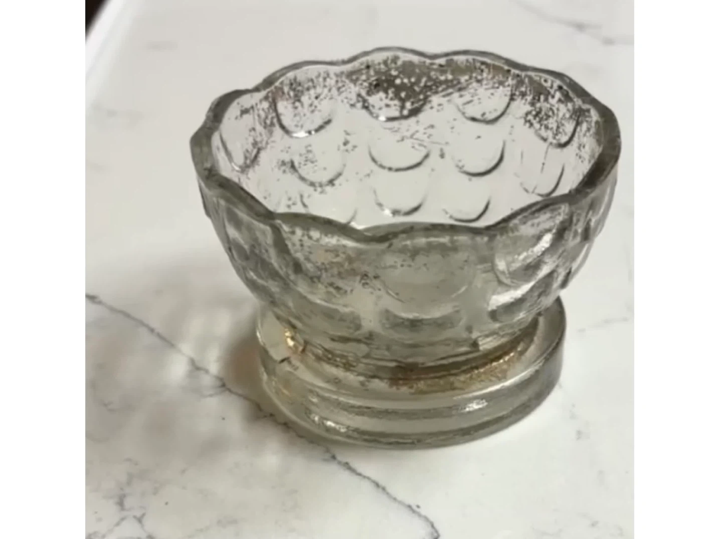 Selling a vintage glass bowl. It has a unique textured pattern and a pedestal base. It's perfect for displaying small items or adding a touch of vintage charm to your home