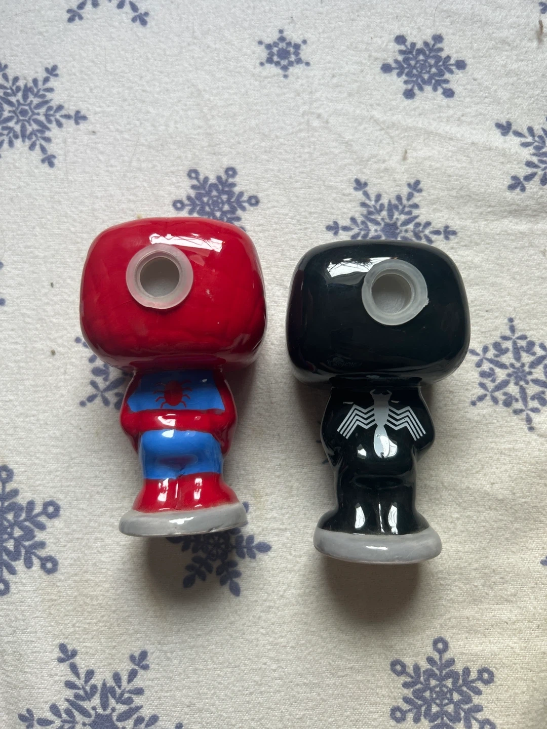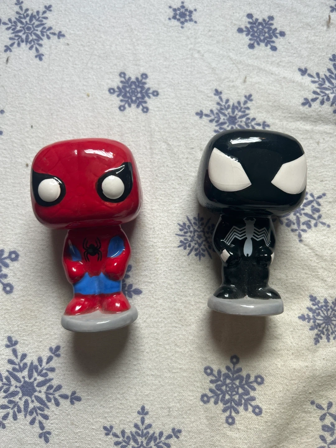 This set includes Spider-Man and Venom Funko Pop salt and pepper shakers. They're made of ceramic and have stoppers on the bottom. Funko Pop characters on display!